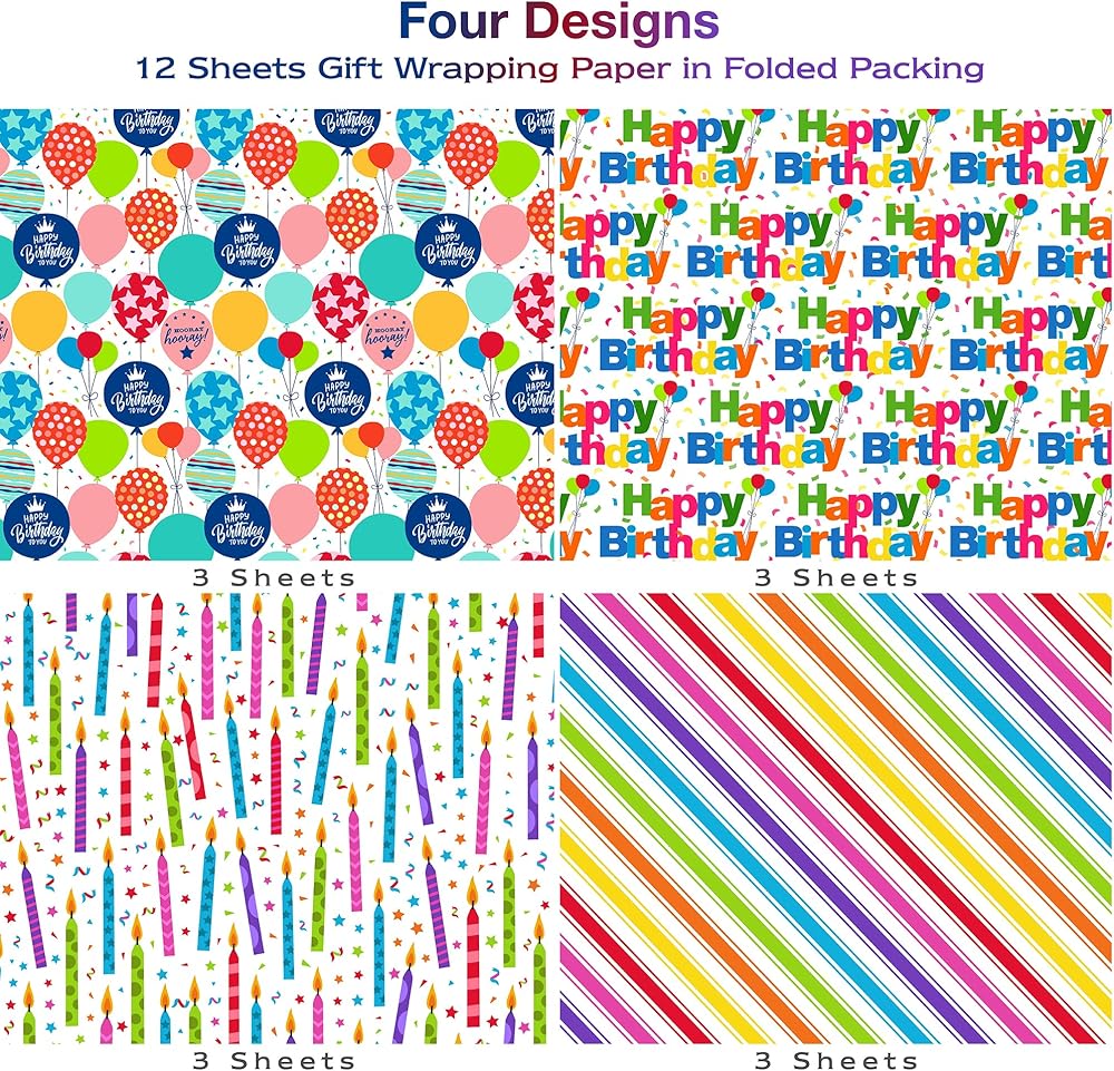 Great Value Birthday Wrapping Paper: Include 12 sheets (4 designs, 3 sheets of each design), each paper 20×28 inches, one set will wrap several small and medium gifts, quickly and easily.