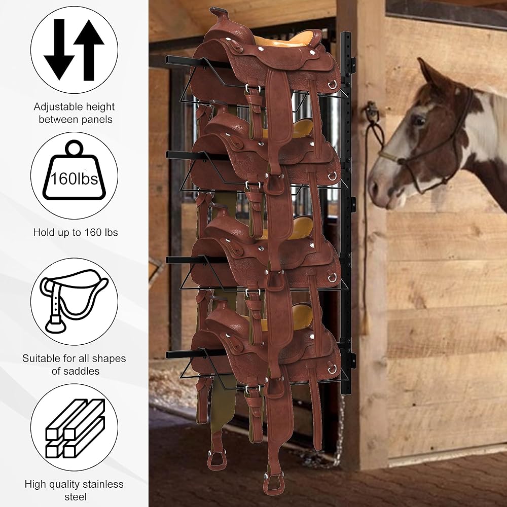 Save Storage Space: The 4-layer vertical wall-mounted saddle rack design can save storage space for the saddle, and the integrated design is more concise and beautiful, keep your stable organized, holds up to four horse saddles and other horse riding equipment