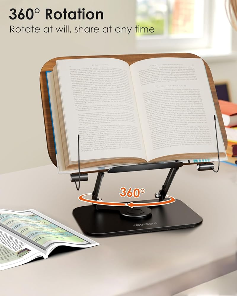 Book Stand for Reading, Aboutool Adjustable Book Holder with 360° Swivel Base & Page Clips, Foldable Cookbook Stand Textbook Stand for Music Scores, Recipe, Tablet, Laptop, Textbook