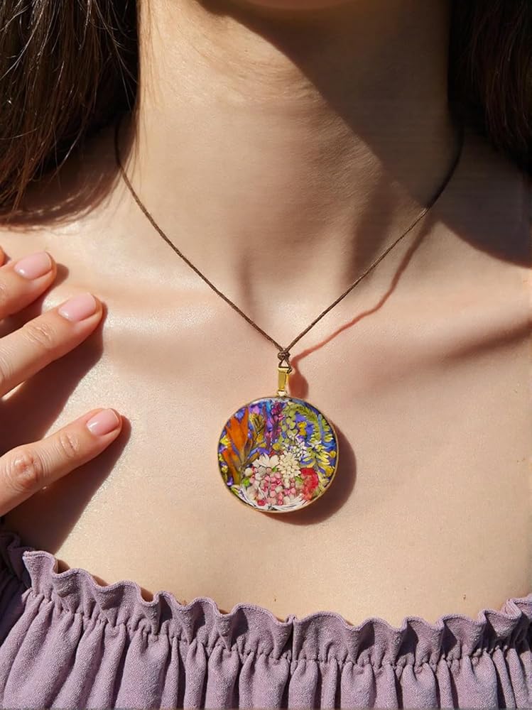 Style:Unique Translucent Round Pendant NecklaceMulti-coloured forget-me-not flowers symbolise elegance. Preserve the natural colour and form of real dried flowers. Elegant. Original flavour. Symbolises wisdom. Good luck. Love. Emotion and friendship, give people a kind of return to nature, fresh and vulgar feeling.