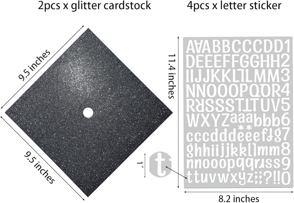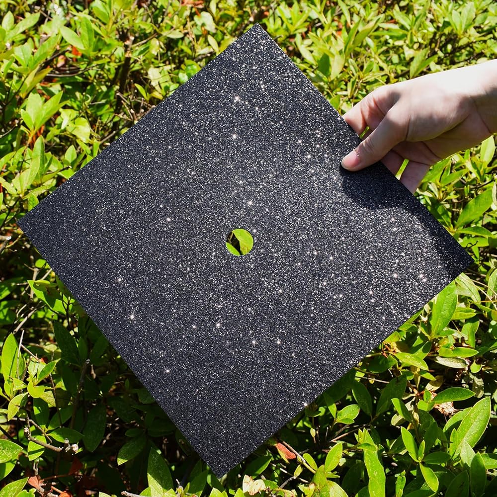 【Super Sparkle Glitter Paper】Our glitter graduation cap cardstock are in a standard size of 9.5x9.5 inches, with a small hole in the middle, large enough to perfectly cover the top of your grad cap. (If your cap is 9x9 inch, then you can cut the blank glitter cardstock to fit.) Basic plain glitter paper base for grad cap topper.