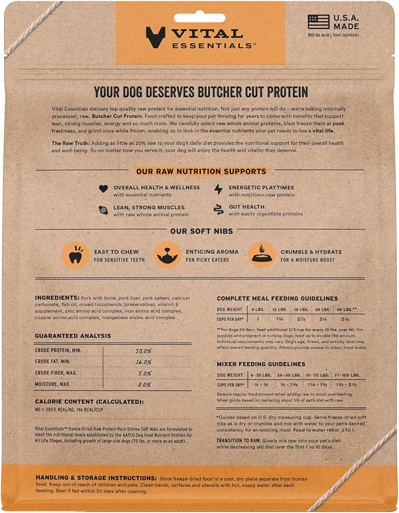 SOFT NIBS FREEZE-DRIED RAW BEEF & SALMON DOG FOOD: Vital Essentials Freeze Dried Soft Nibs Dog Food packs more protein than industry standard into every soft bite to deliver the peak vitality your dog deserves, especially when compared to dehydrated dog food. This complete and balanced freeze-dried raw dog food is made with premium Butcher Cut beef and salmon, responsibly sourced in the USA.