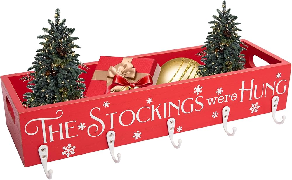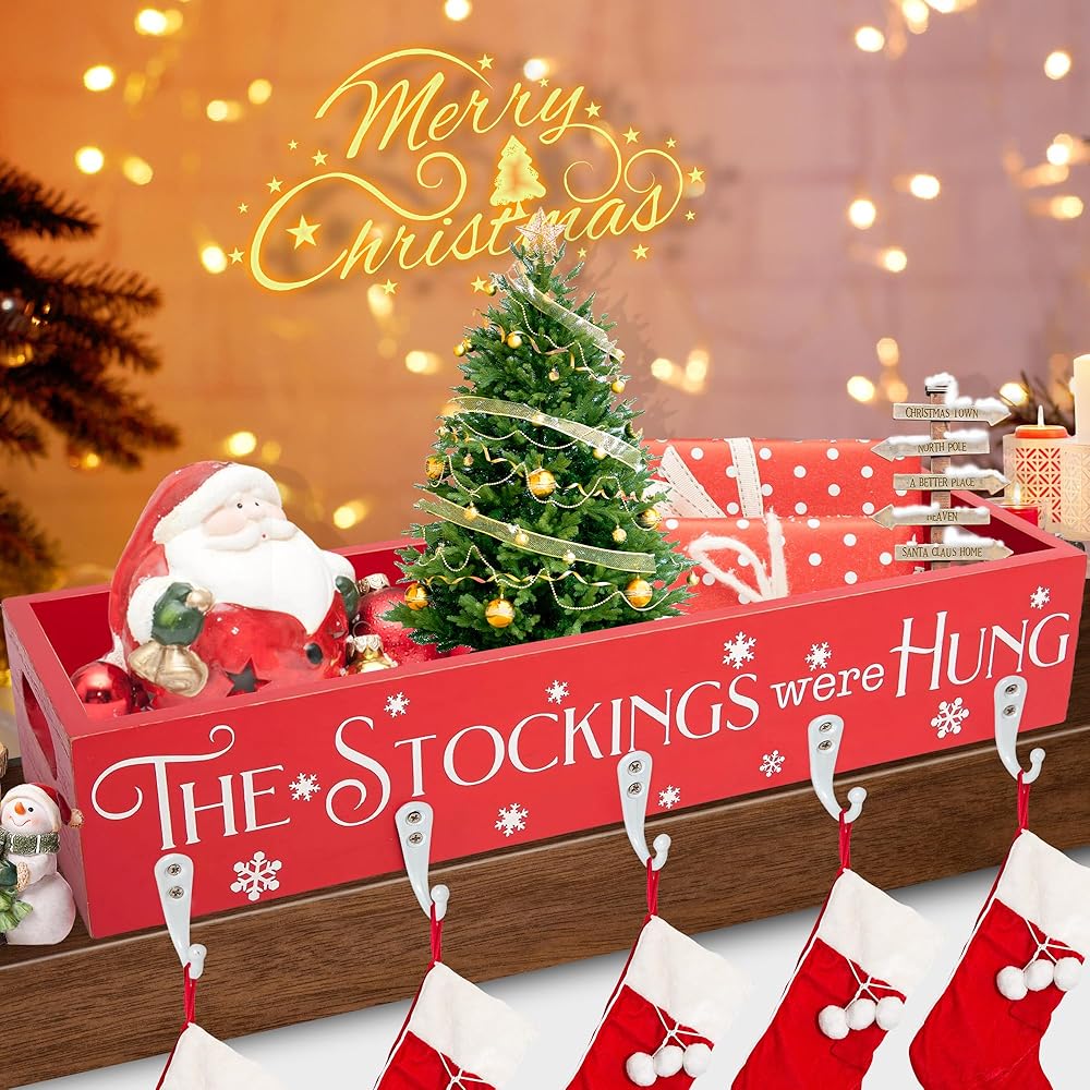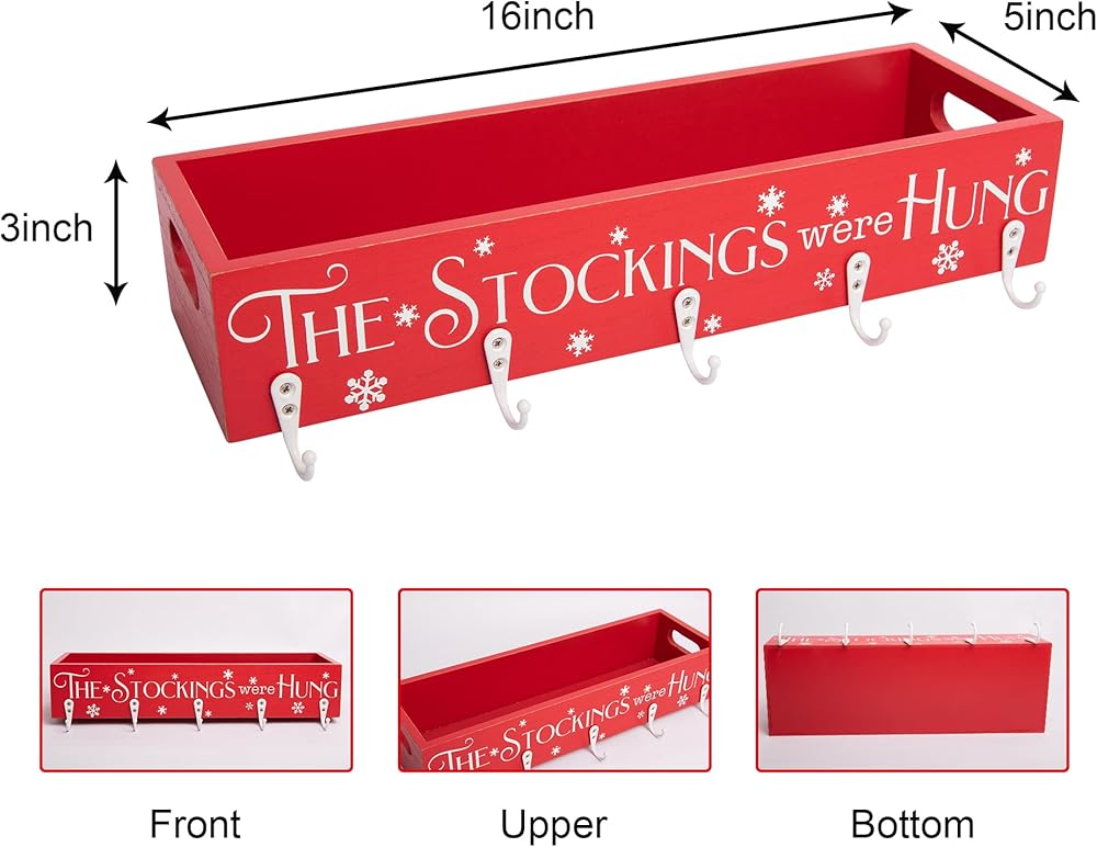 Red Christmas Decor: Mantle stocking holders include 1 piece of wooden box with 5 hook stockings hangers (no decorations are included).This merry Christmas mantel stocking box is nice to hang stockings for your whole family.