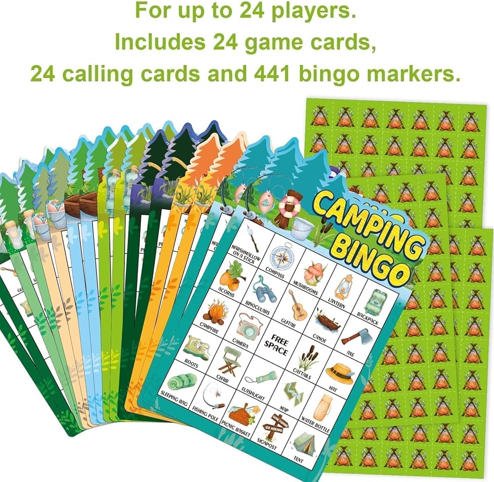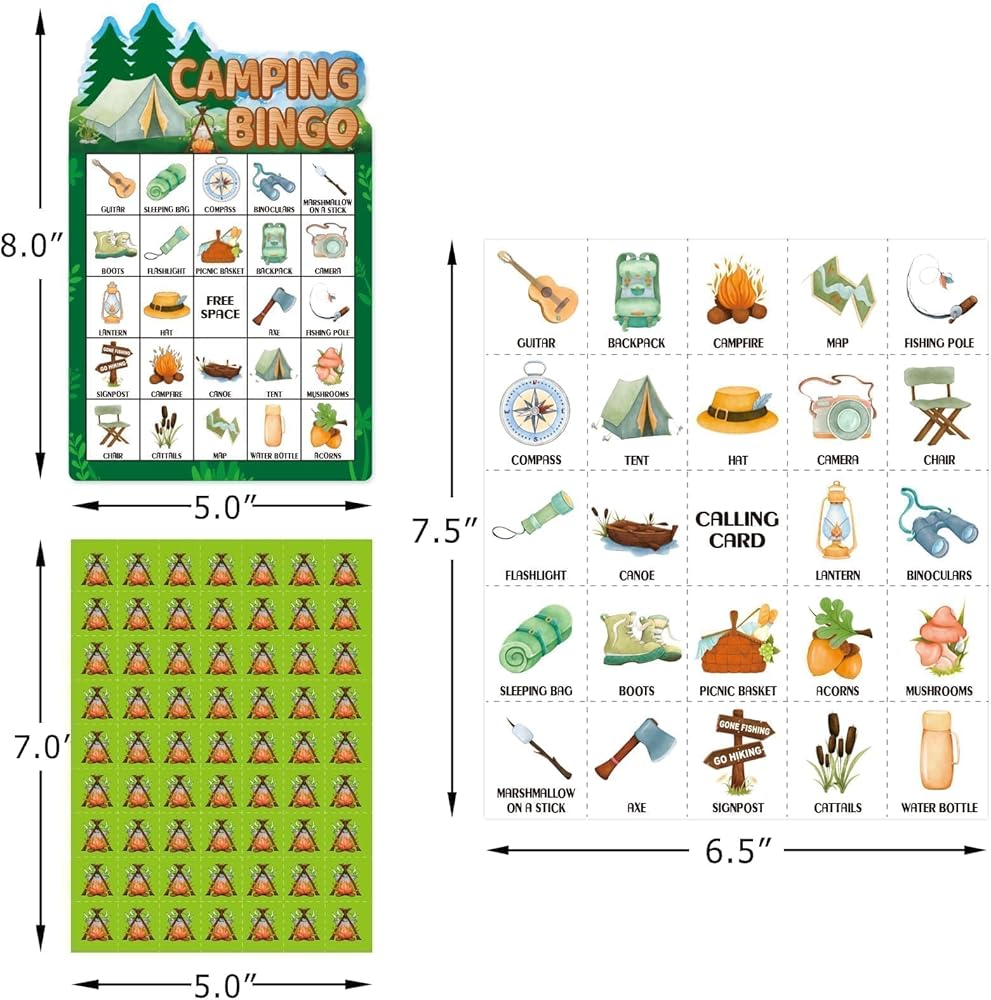 Package Includes: 24 camping bingo game cards, 441 campfire bingo card chips, 24 call out cards; 8 x 5 inches player cards; Easily cut along dotted lines of chips sheets and calling card sheet