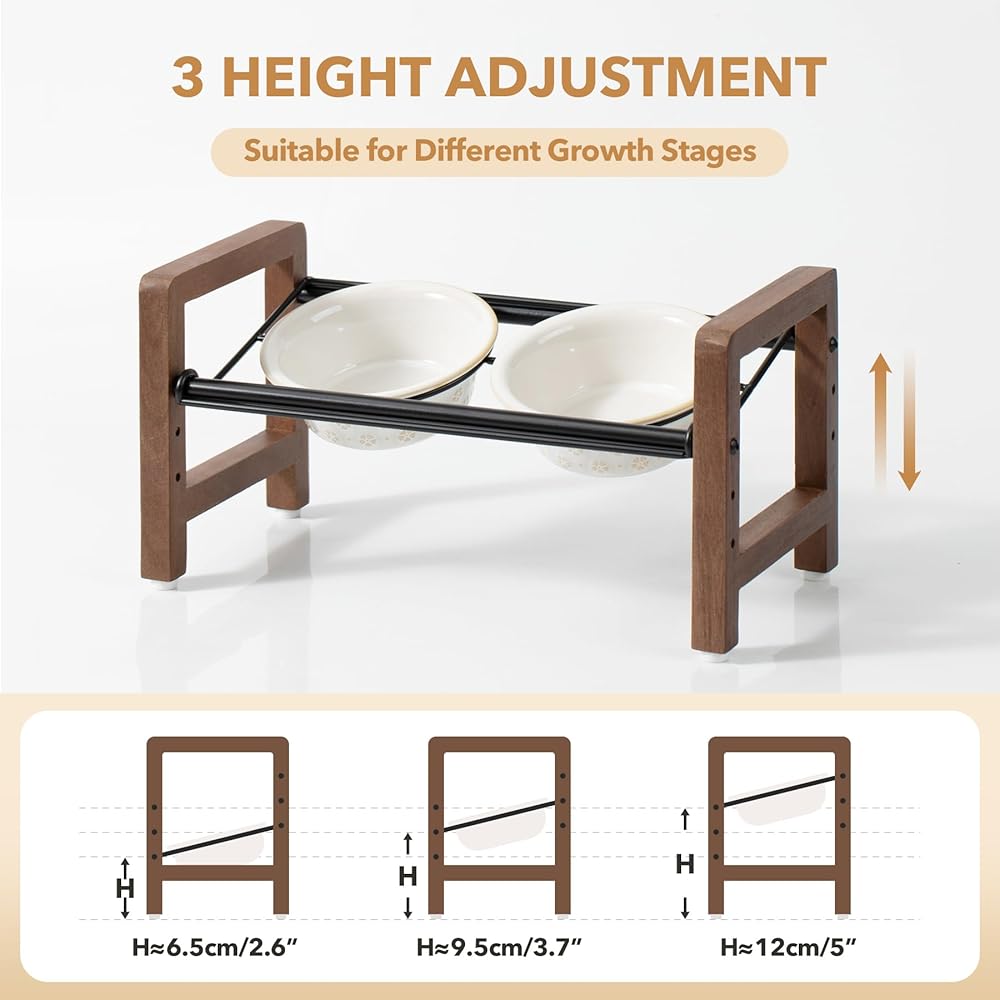 3 Adjustable Heights & 2 Placement Options: This stand offers 3 adjustable heights, ranging from 5.5 inches to 8.7 inches, catering to the needs of pets at different growth stages. The circular metal component on top of the stand features two distinct placement options, allowing the bowls to be either horizontally aligned or tilted. Our products are designed to help protect the pet's cervical spine and meet their diverse needs.