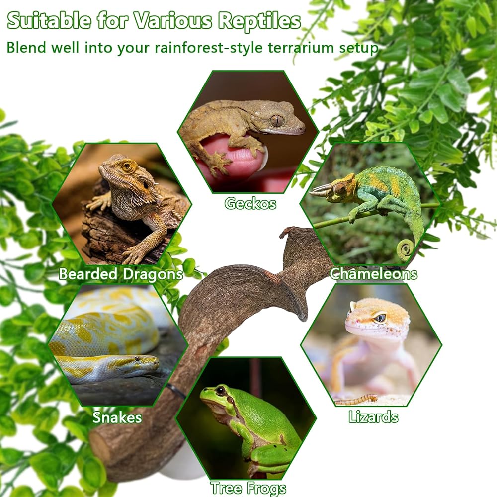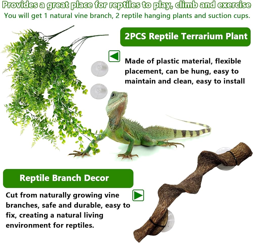 [3 Pcs Reptile Decorations]: Each set contains 1 reptile climbing branch, 2 hanging plastic plant decorations, and 2 suction cups. It can be easily installed in various reptile living spaces such as snake tanks, lizard tanks, and fish tanks to create an exclusive little world.