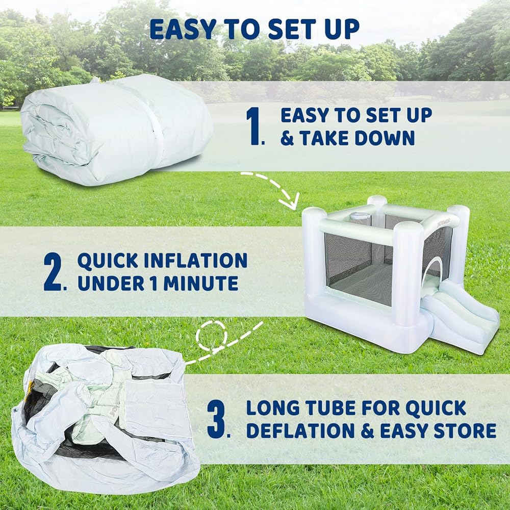 【Easy to Set Up&Take Down】- The inflatable bouncy castle just takes less than 1 minutes to inflate. This jumping castle is easy to use and carry, and perfect for the park, garage, backyard, etc. It is very easy to take down, the air will be exhausted and folded. When stored, its size does not take up too much of your space. This inflatable bouncer includes the bouncer, air blower,repair patches,lawn stakes and a portable carrying bag.