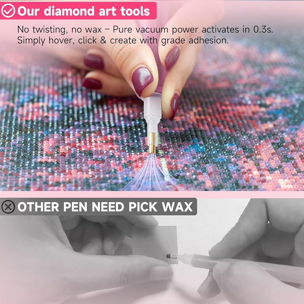 ✨[Innovative Tech for Pristine Art]: Say goodbye to sticky wax! Our electric diamond painting pen features breakthrough vacuum suction to pick up & place drills precisely without wax residue. Keep your diamond art canvas clean while achieving flawless detailing. The vacuum pen for diamond painting ensures brighter, more vibrant artwork vs traditional wax methods. Perfect for diamond painting accessories enthusiasts!