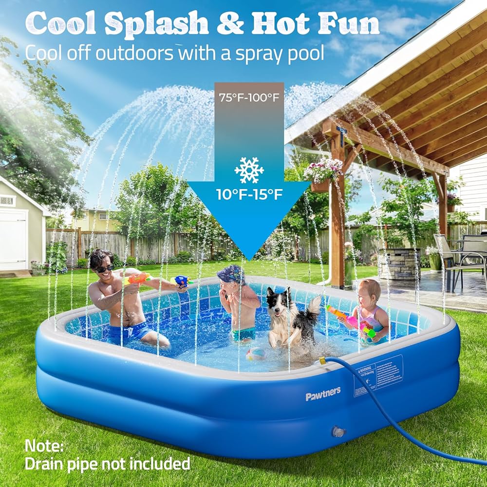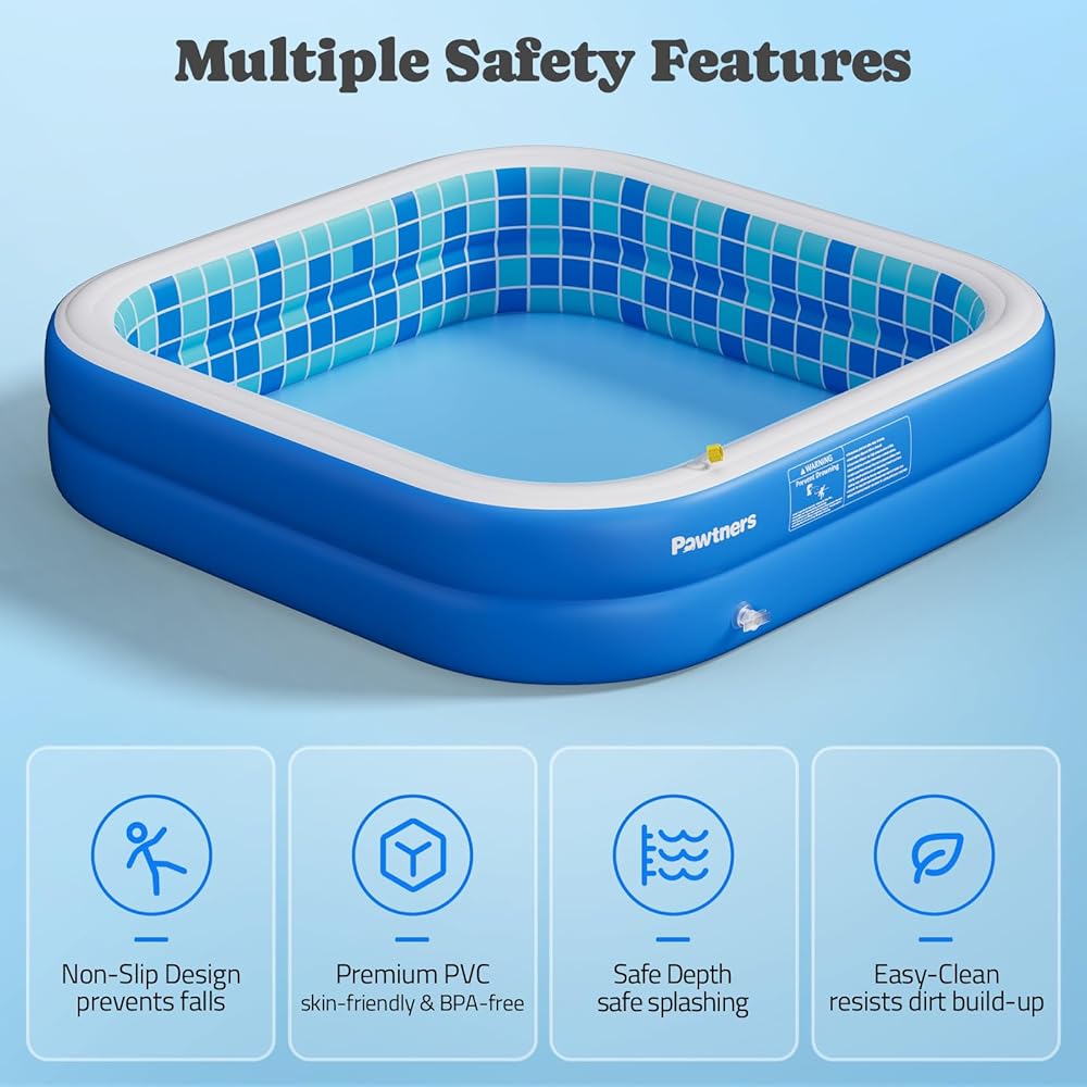 Multiple Safety Assurances: The adult inflatable pool is made of composite PVC material with thickened side walls of 0.42mm and a bottom of 0.5mm, which does not contain BPA. The dog splash pad has a diamond-tread anti-slip texture (friction coefficient: 0.8) for family-safe splashing