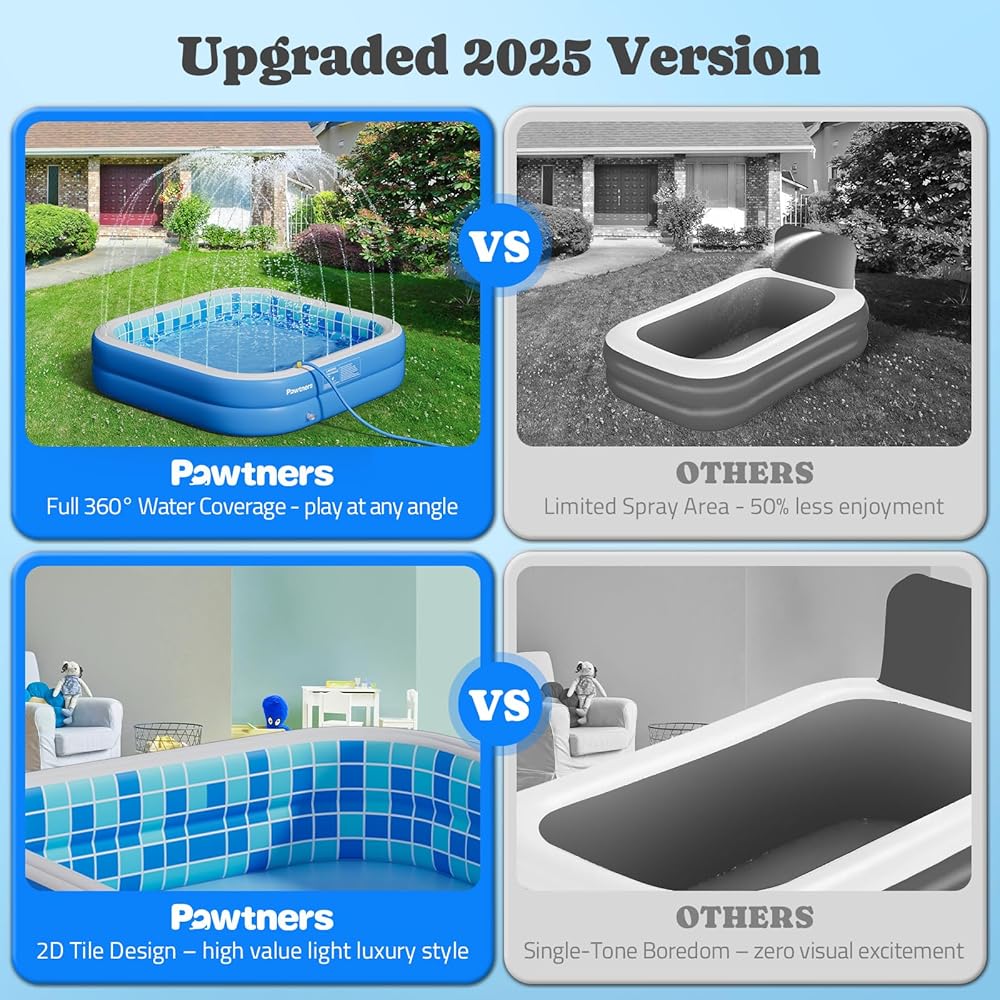 All-Around Water Spray: Sprinkler pool features a 360° all-directional with powerful water flow. Unlike single-directional spray pools, our full-coverage design ensures no-spot-left-behind water fun and superior cooling performance for maximum summer enjoyment