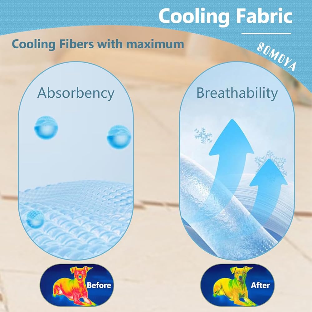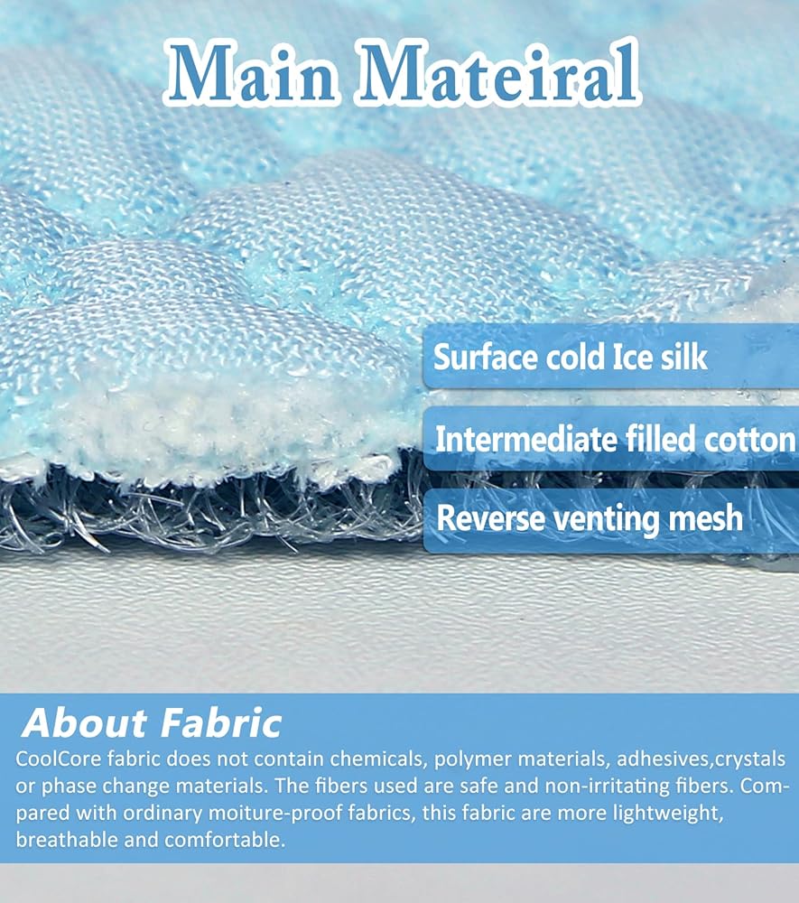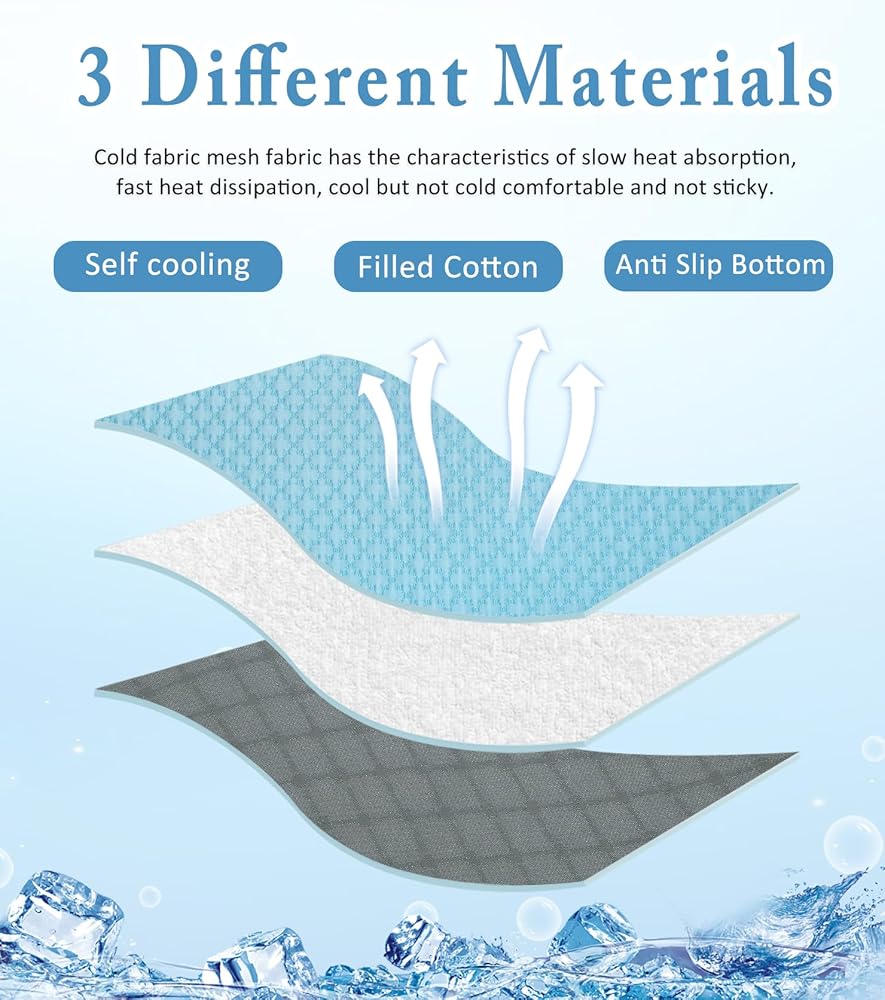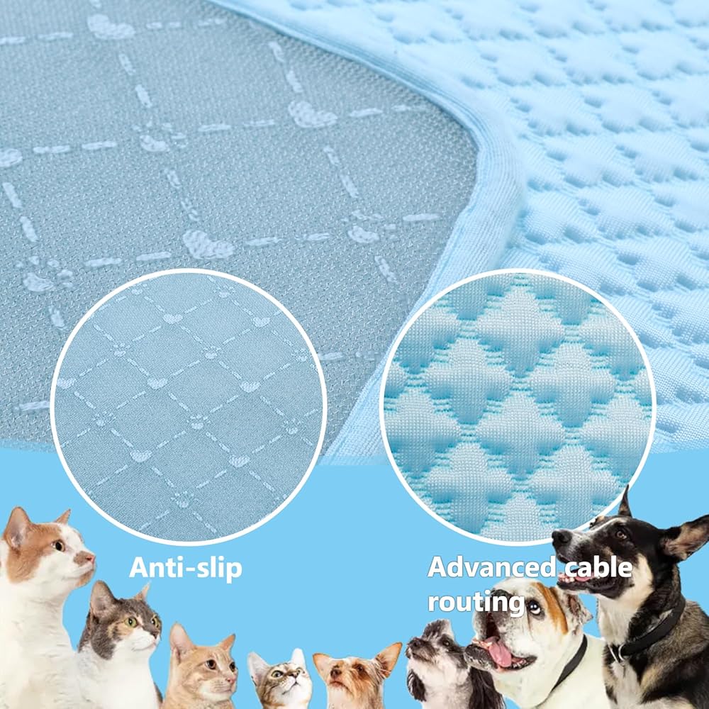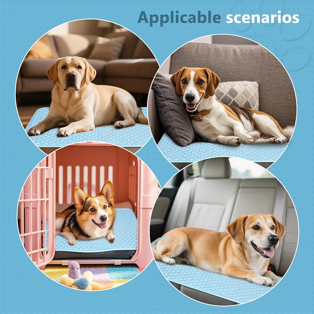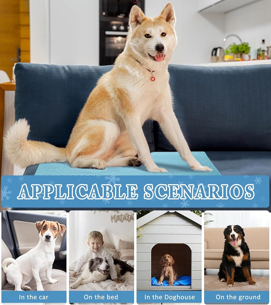 ●Dog Cooling Mat Advanced Cooling Technology: Cooling mat for cats or dogs Infused with high-performance material, our cooling mat effectively absorbs and dissipates body heat, providing a constant cool surface for your dog to relax on.