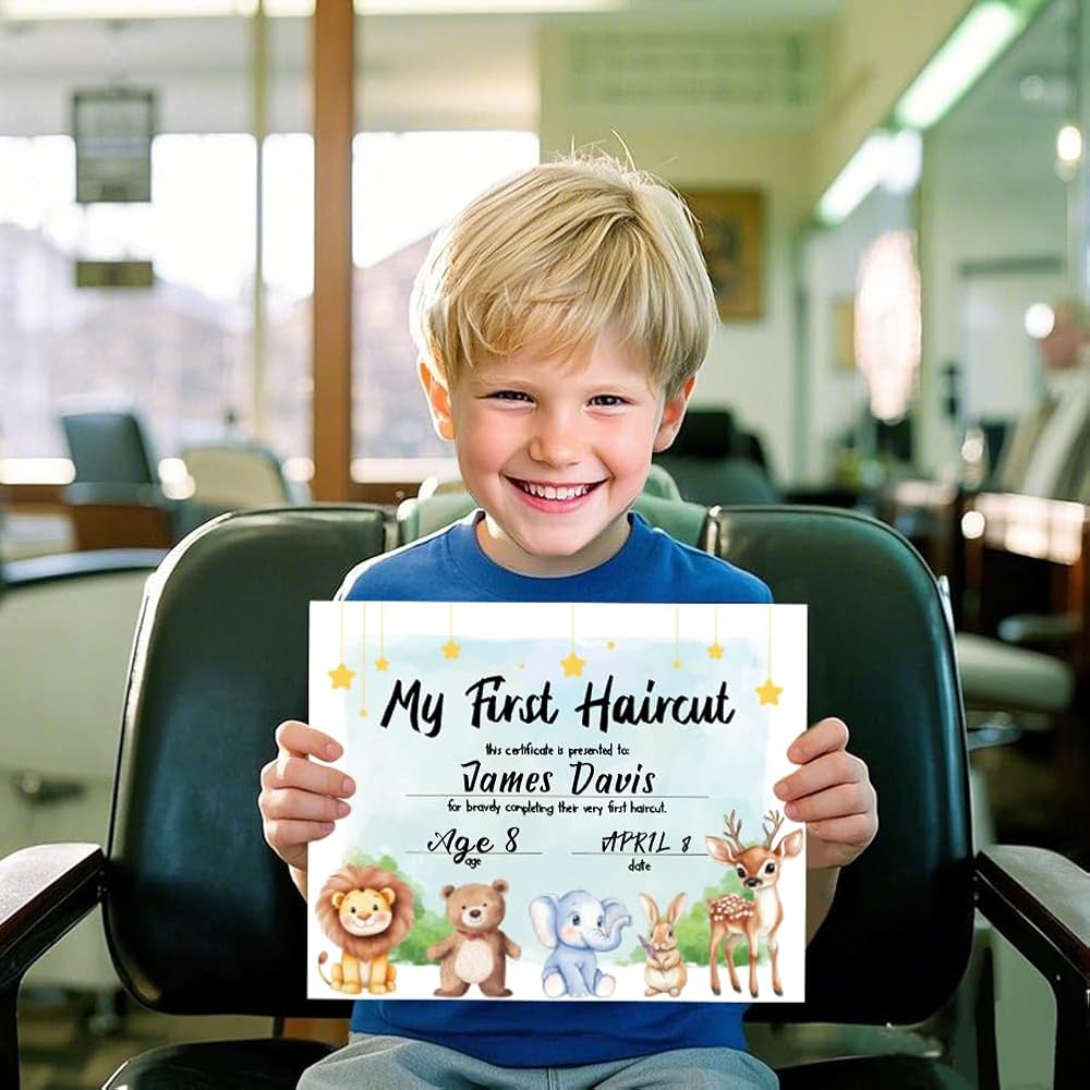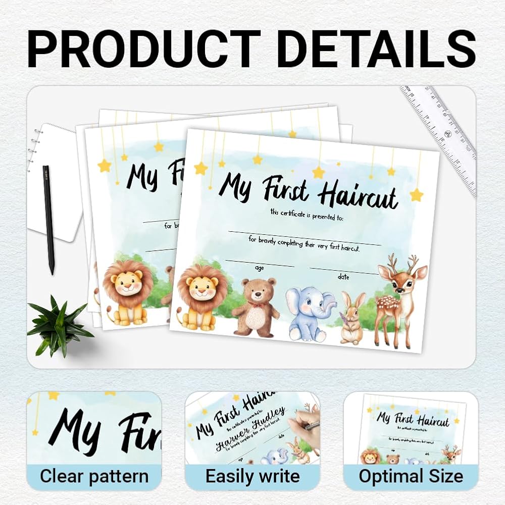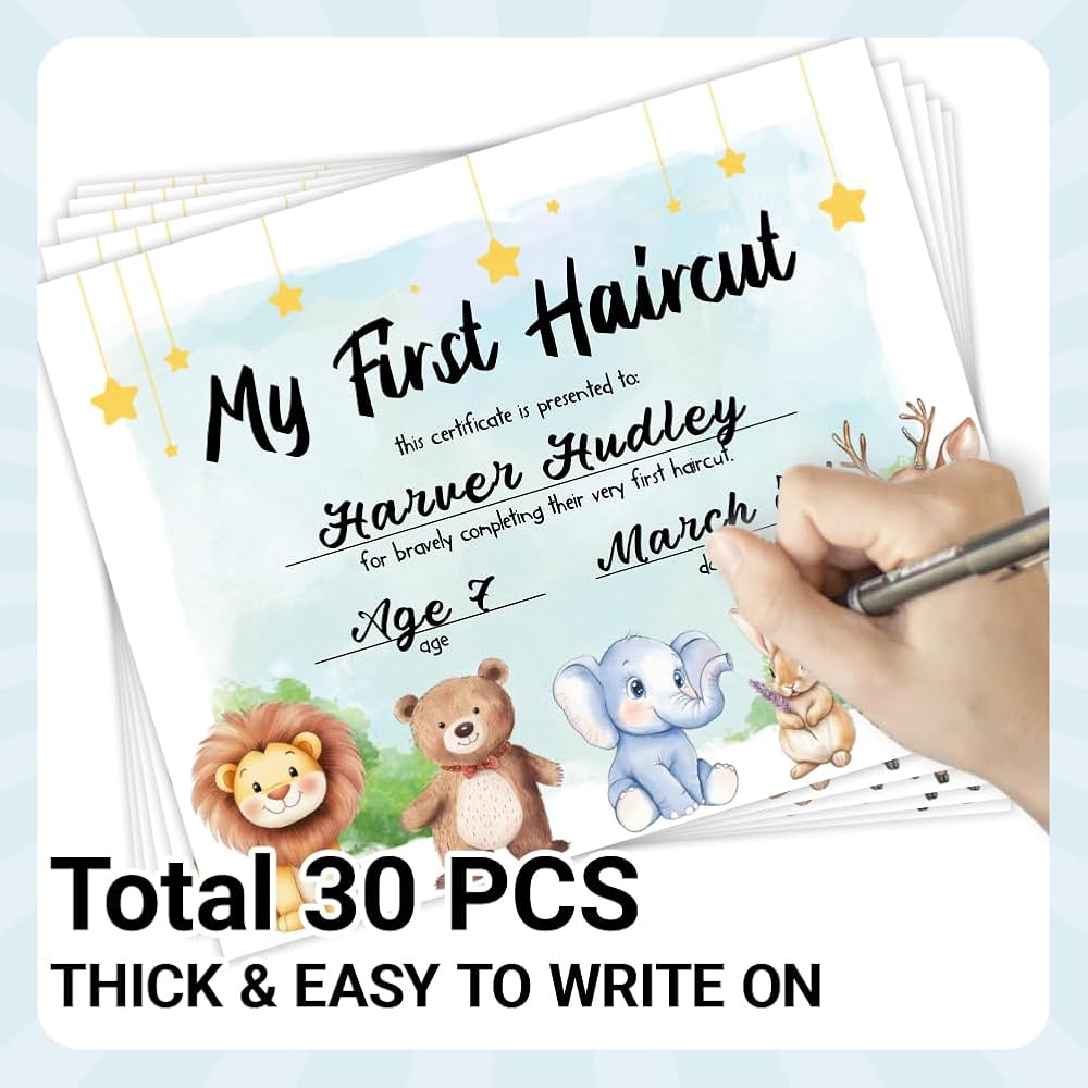 30 My First Haircut Certificates Award Paper for Baby, 9.8" x 7.8" Blank Haircut Keepsake Certificates Milestone Marker with Cute Animal Lion Giraffe Rabbit Deer for Hair Salon Barbershop