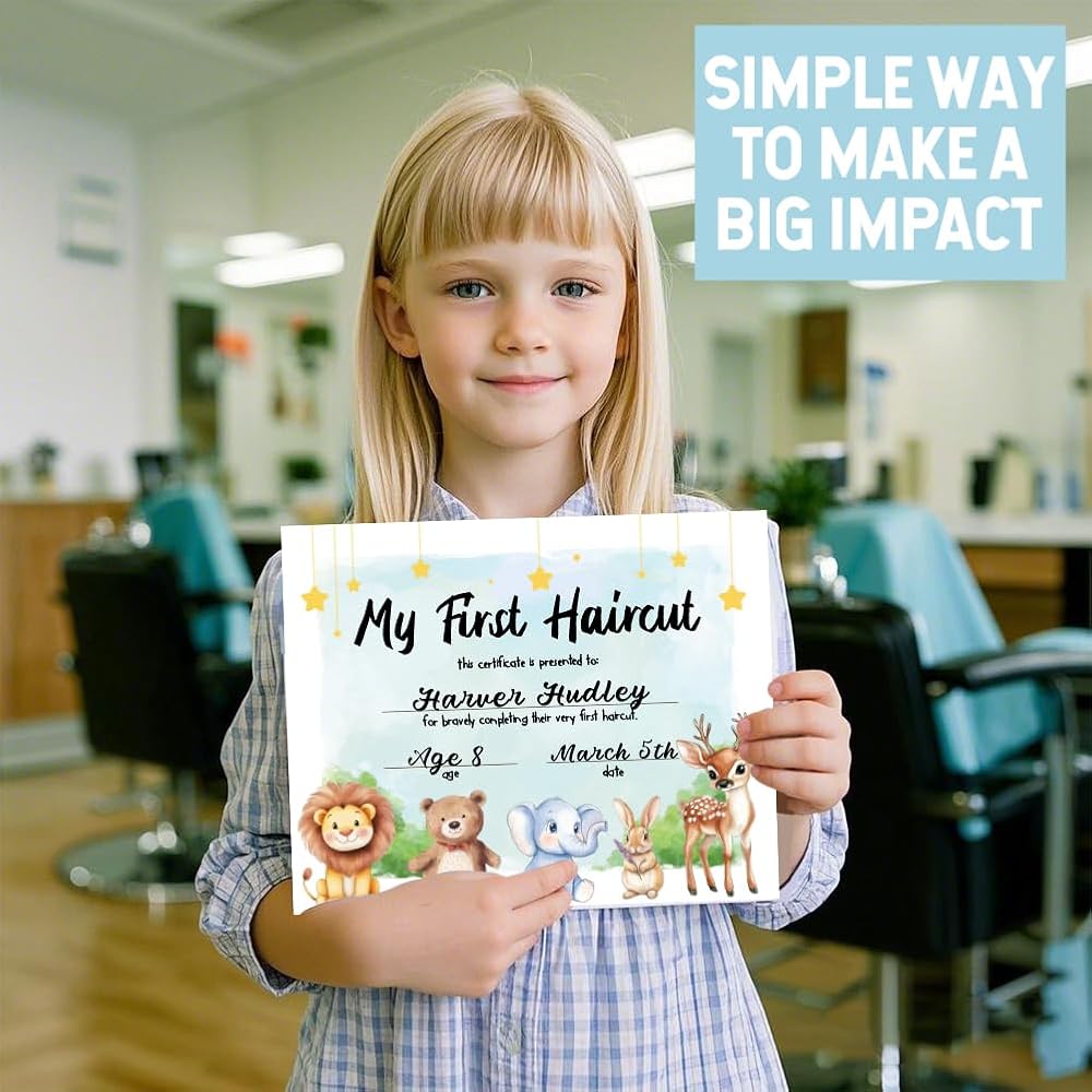 30 Pack First Haircut Certificate Papers: You will get a total of 30 pieces of blank cartoon baby hair salon certificates, which are enough to be sent to your family or friend kids