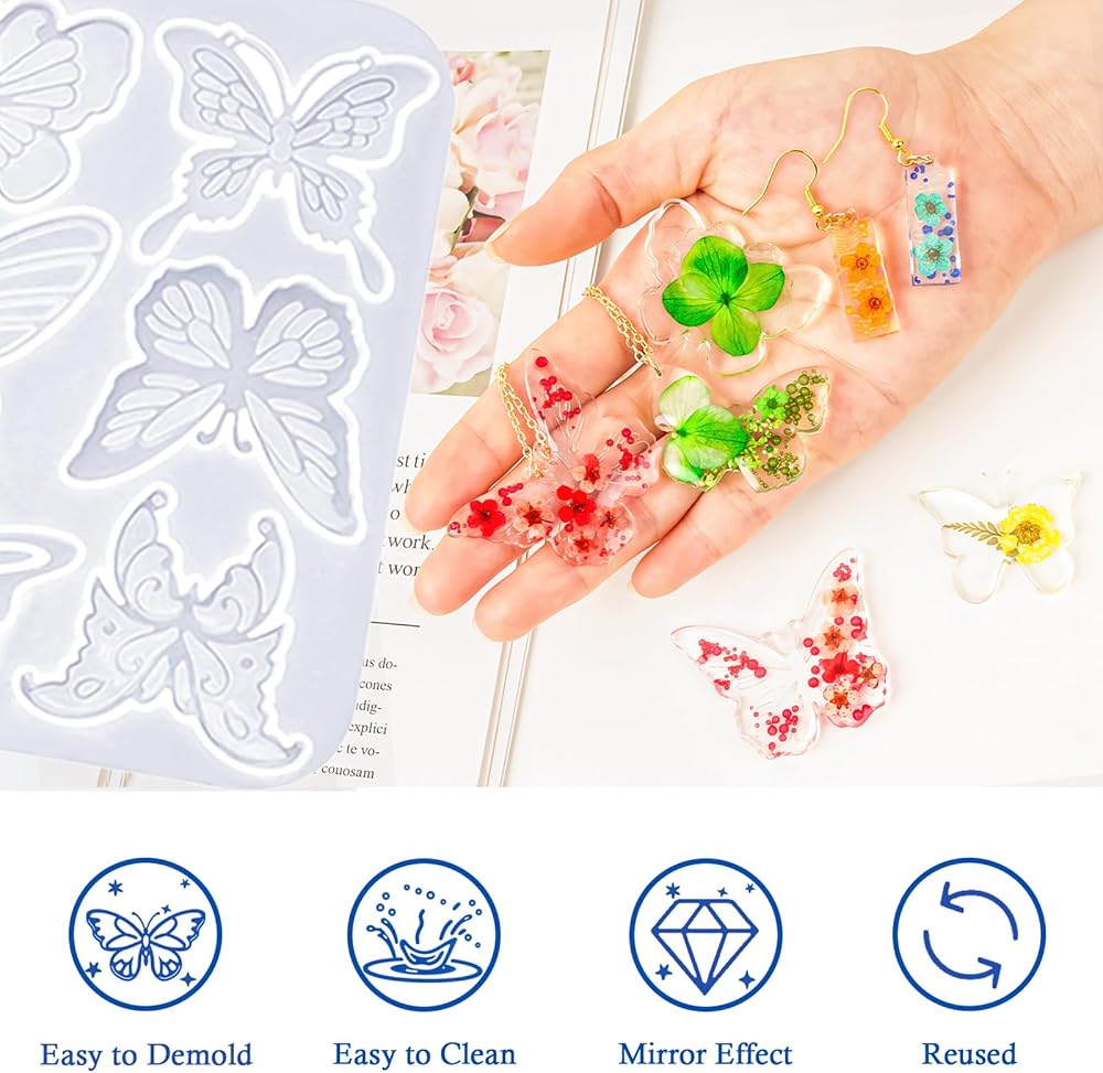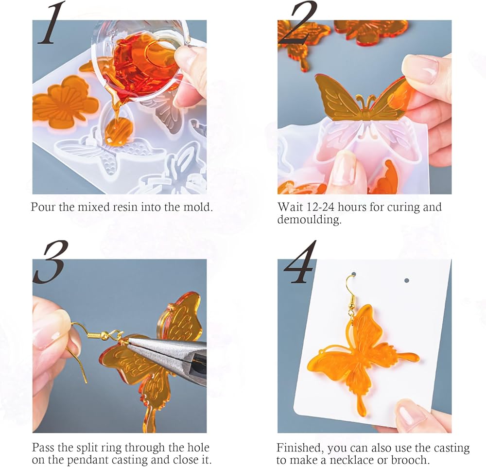 Products include: 4 butterfly silicone Molds, 20 ear hooks, 50 opening rings, 10 black leather ropes, 20 disposable color cups, 5 dropper, 3 stirring sticks