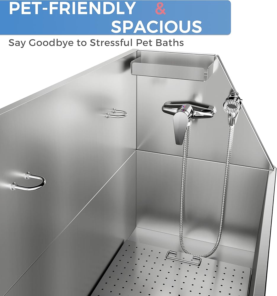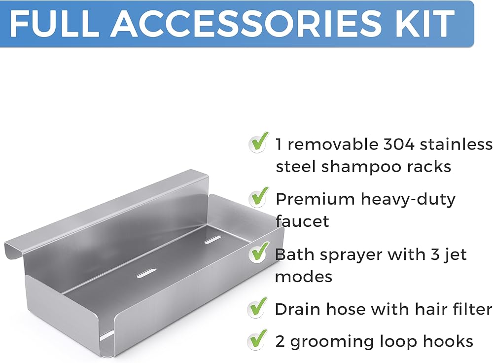EVERYTHING YOU NEED – QUICK AND EASY SETUP! Our dog grooming tub includes all the essentials to get you started right away: a premium-quality faucet, a multifunctional showerhead, a reliable drainage system with a flexible hose and hair trap, and a removable shampoo rack. Designed for durability and ease of use, it delivers a smooth, stress-free bathing experience for both you and your furry companion.