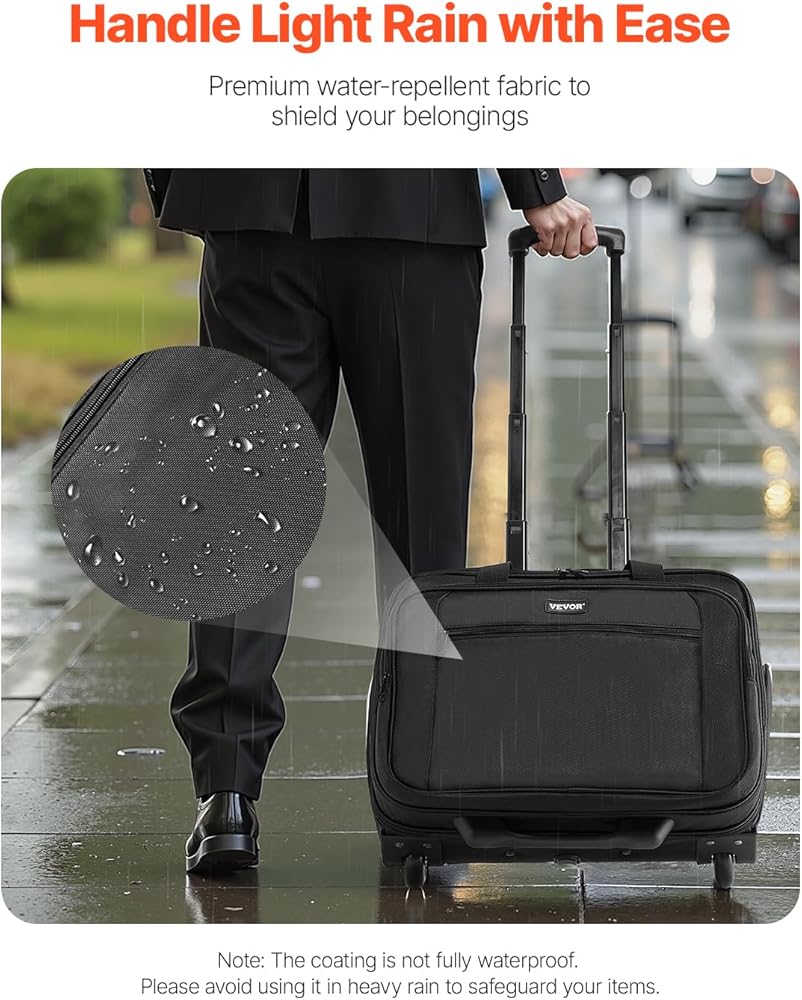 Durable Fabric, Long-Lasting Use: Crafted from premium 1680D Oxford fabric, this rolling computer bag is tear-resistant and wear-resistant for long-lasting use. The water-repellent coating keeps laptops and documents from unexpected rain, delivering added peace of mind