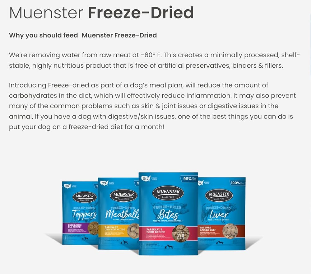 Muenster Freeze Dried Food Topper for Dogs: Inspired by Chef Paul Prudhomme's legendary creation, our Turducken dog food sprinkle topper blend premium freeze dried turkey, duck, and chicken into a flavor explosion your pet will crave. Tur-duc-ken Dog Meal Toppers is a unique combination of three meats with natural freeze dried nutrition in a convenient, shelf-stable form. Perfect for all dog breeds and sizes! Use these freeze dried meal toppers for dogs as meal toppers and mix-ins—serve dry or reconstitute with warm water for a meaty texture your dog will love. Crafted at -60ºF, the gentle freeze-drying process of this dog food seasoning with turkey preserves essential dog-friendly vitamins, minerals, and flavors while eliminating artificial preservatives, fillers, and binders. Packed with protein, fat, and fiber-full ingredients, these freeze dried pet food toppers for dogs support overall well-being. Put this dog meal topper in your dog's food for a month to help reduce the amount of carbohydrates in the diet which reduces inflammation, and may also help prevent skin, joint, or digestive issues. Please Note: The freeze dried dog toppers for dry food are intended for intermittent or supplemental feeding only. Treat your pet to wholesome, protein-rich flavor! About Us: Muenster Pet creates premium dog and cat food, meal toppers, and treats. We've made quality a tradition since 1932 and proudly craft everything ourselves in Texas using the finest ingredients.
