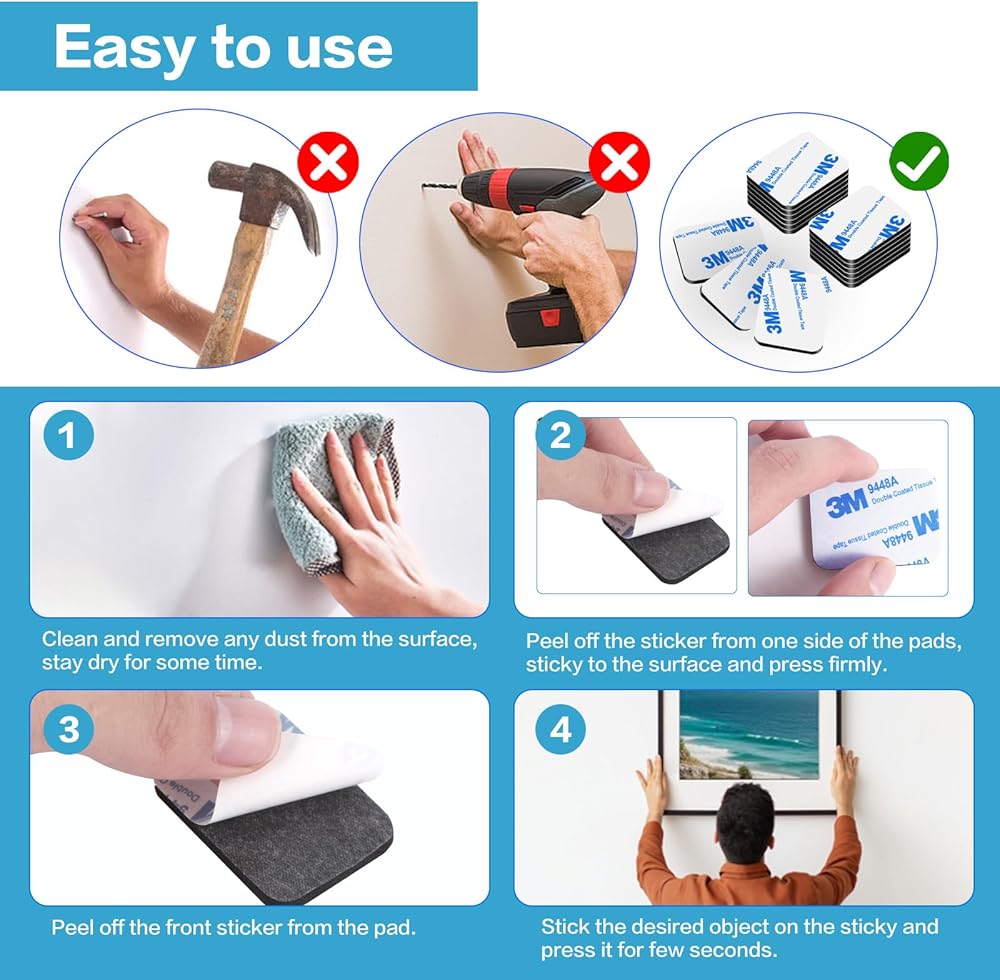 EASY APPLICATION:Heavy Duty 2 Sided Sticky Pads need Four-step installation process 1.Clean the surface to ensure it's free from dust, dirt, and grease 2.Peel off the backing from the adhesive pads 3.Press firmly to stick the pad onto the desired surface 4.Mount your item and press it , long-lasting super strong adhesive