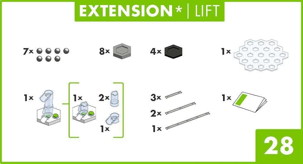 Included is 1 Lifter, 1 clear level, 8 large height tiles, 4 small height tiles, 1 long track, 2 medium tracks, 3 short tracks, 7 metal marbles and instructions.