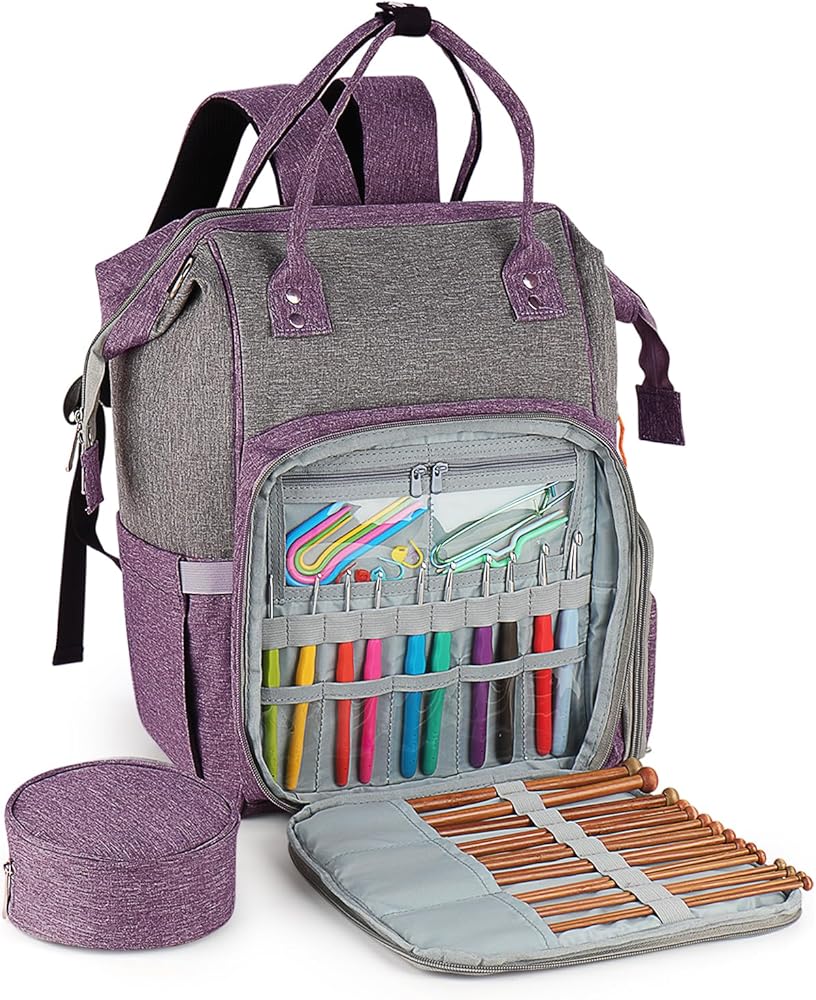 [VERSATILE KNITTING AND CROCHET BACKPACK] It has a ton of compartments for storing items inside and on the outside of the backpack. It has backpack straps and small straps on top that snap together in case you want to carry it in one hand. The front outer compartment zips open to reveal a large space where you could easily store knitting needles or crochet hooks (or for sewing,scissors,pencils,rulers etc.). It has 3 riveted holes on each side of the bag where you can pull your yarn through.