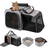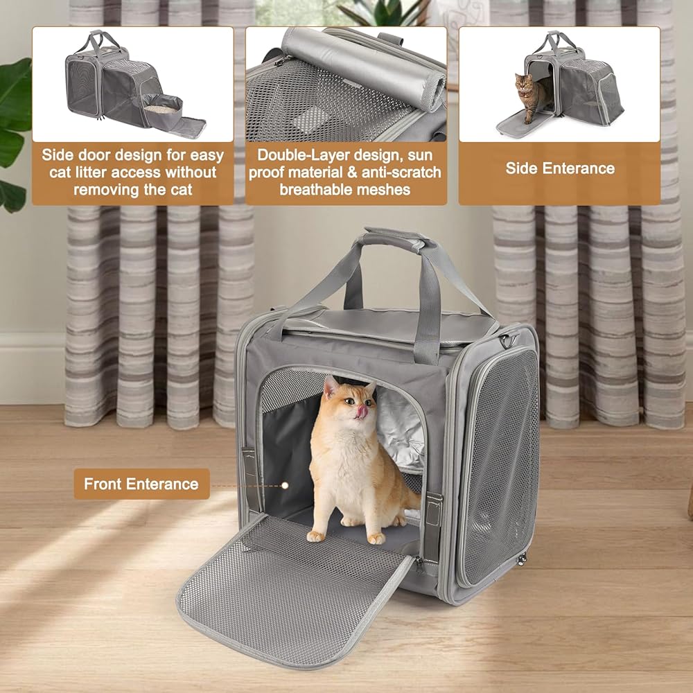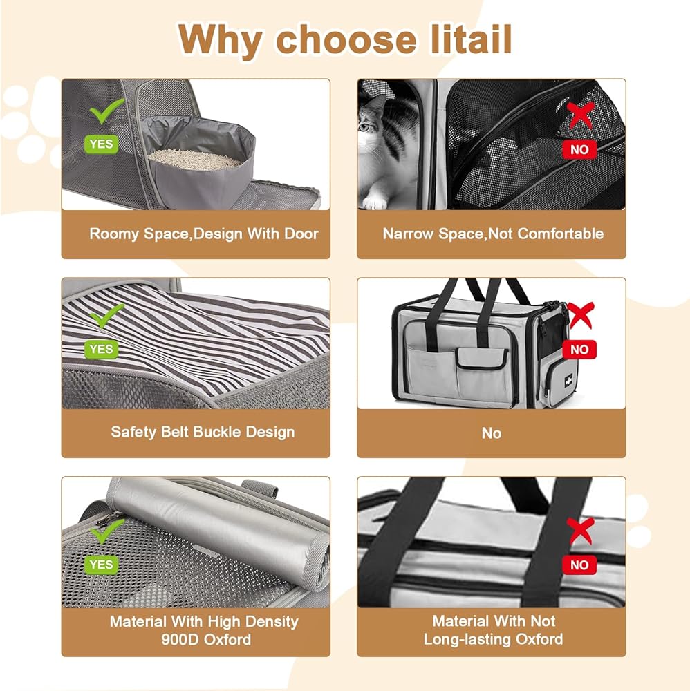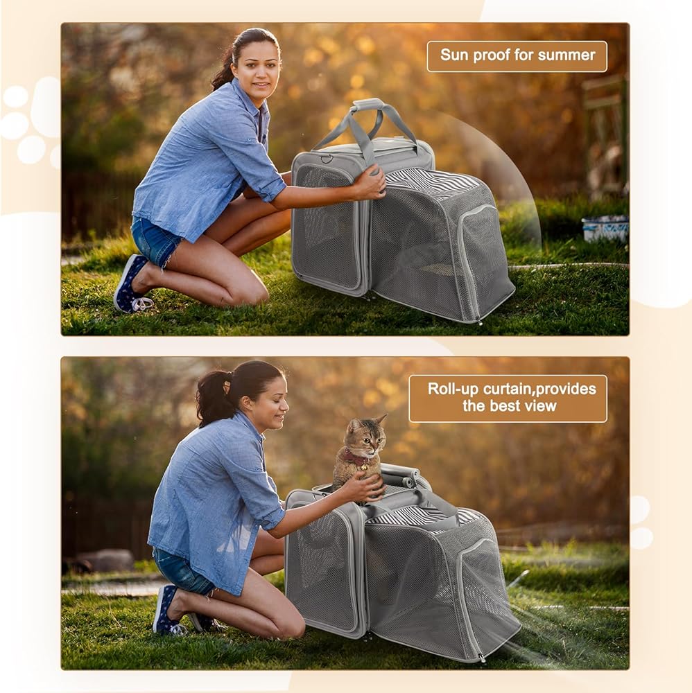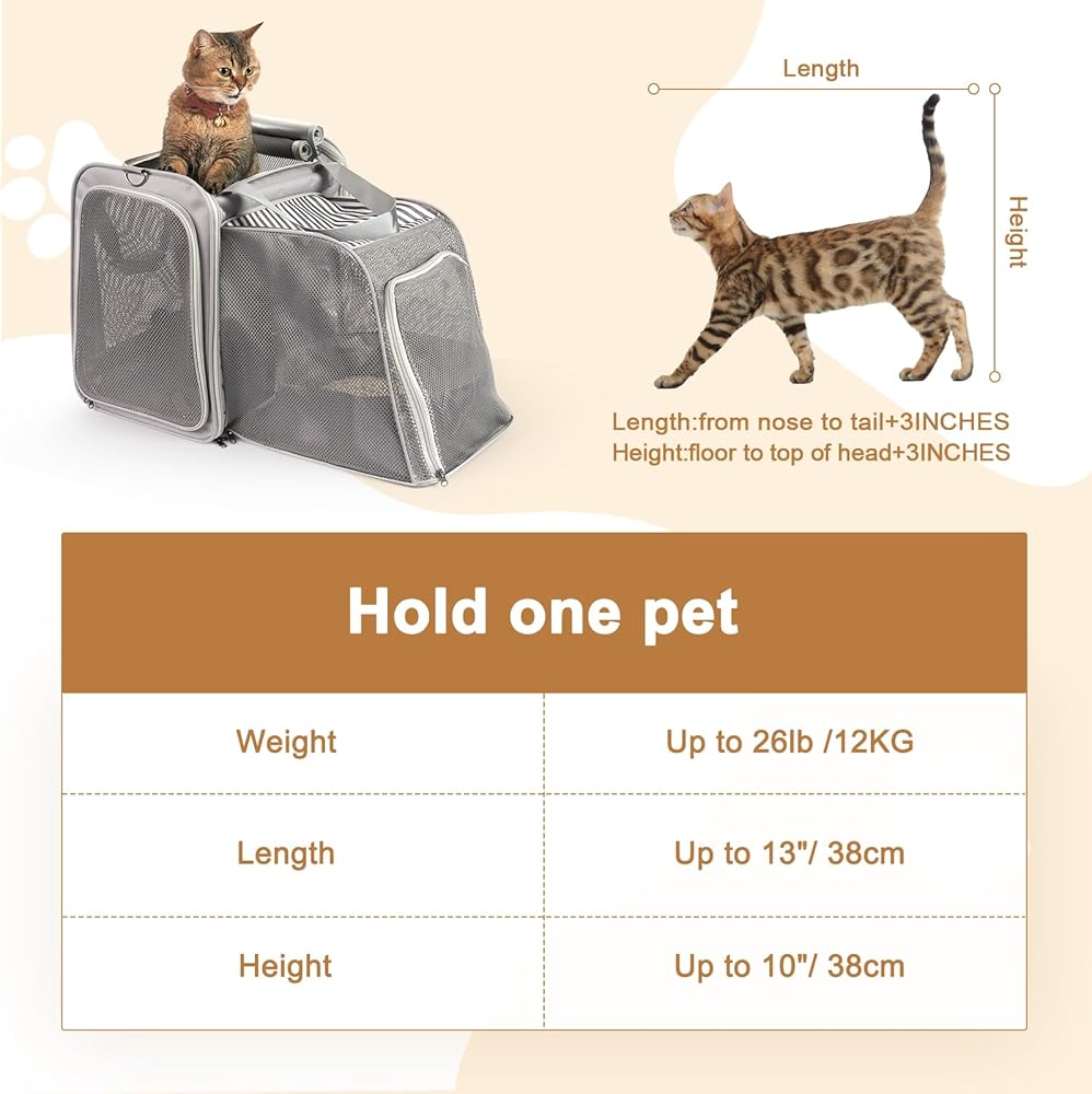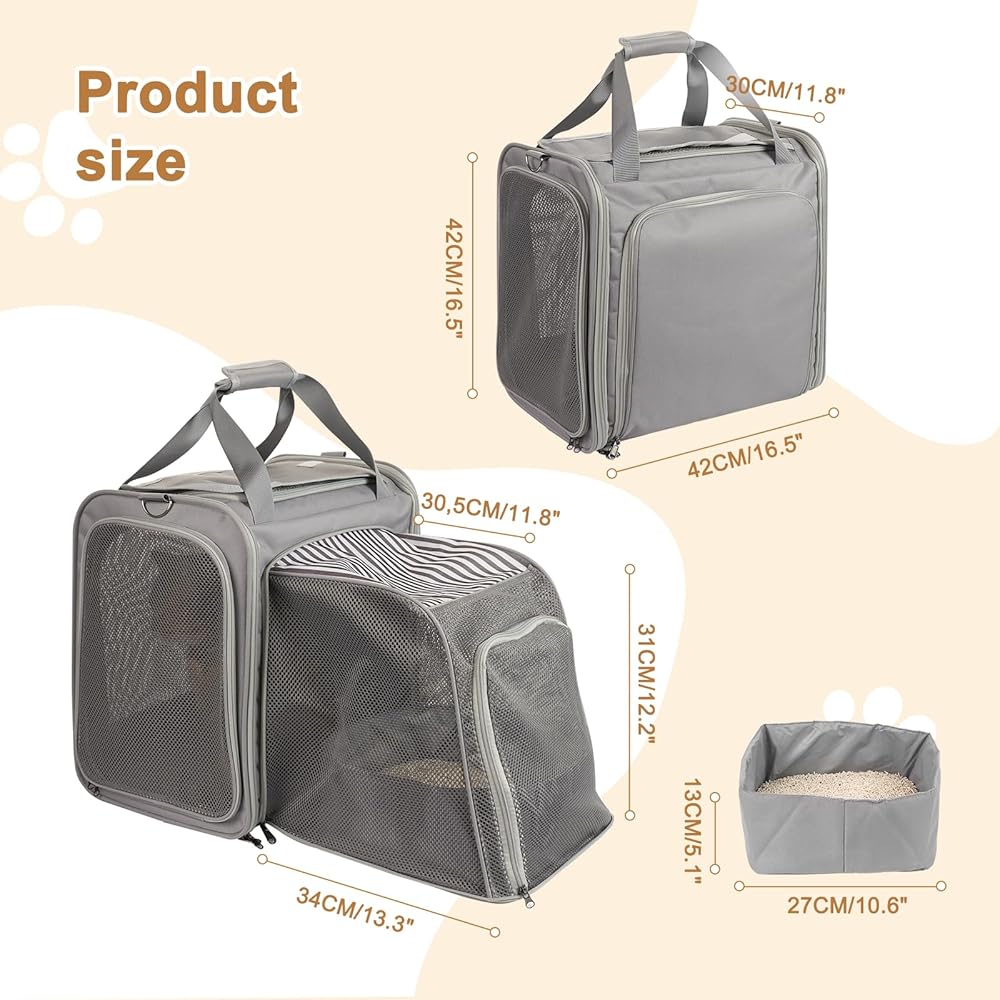 Cat Carrier with Litter Box: The large, expandable compartment allows your pets to easily turn around and stretch. Due to the sufficient space, your furry friend can lie down comfortably during long journeys. Recommended for pets up to 20 lbs