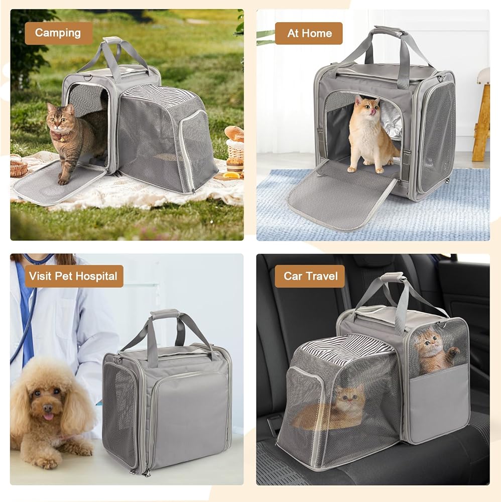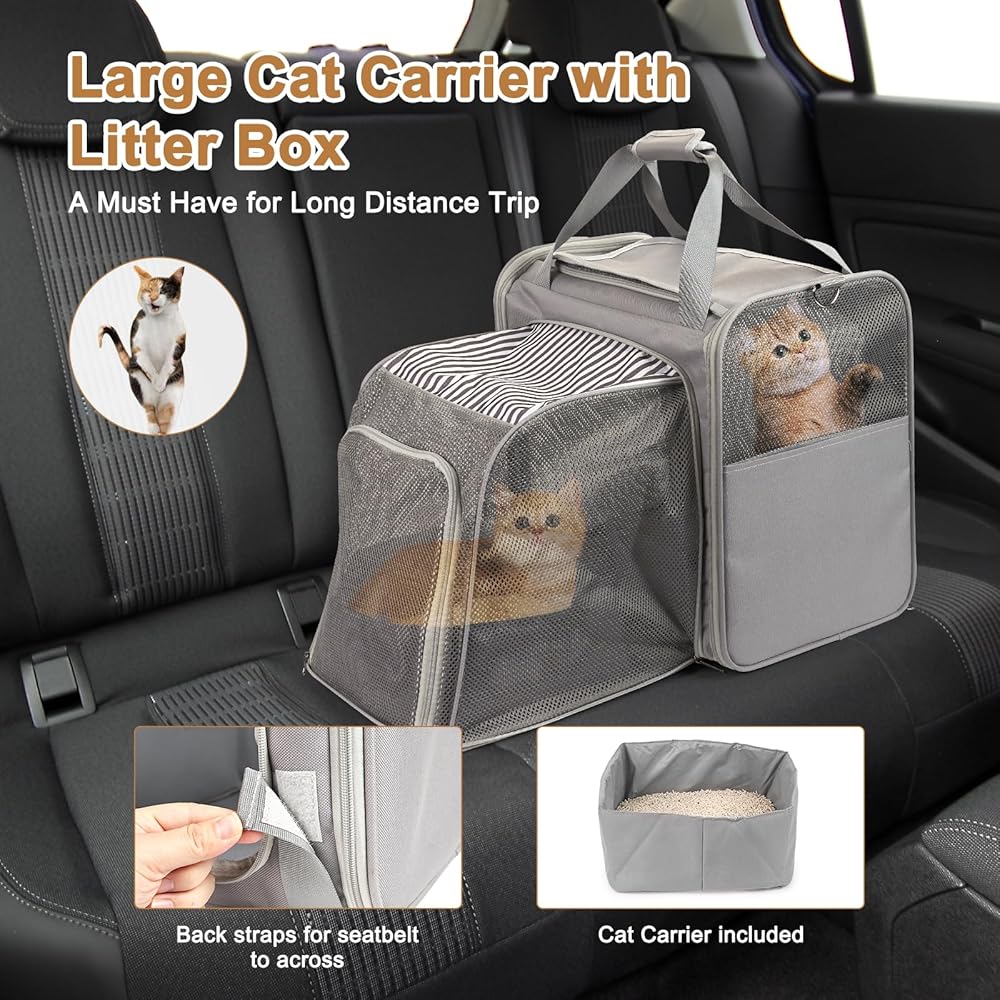Expandable Cat Carrier with Portable Litter Box, Soft-Sided Pet Travel Carrier for Large Cats up to 20 lbs, Foldable Car Seat Crate for Long Distance Road Trips, Light Gray