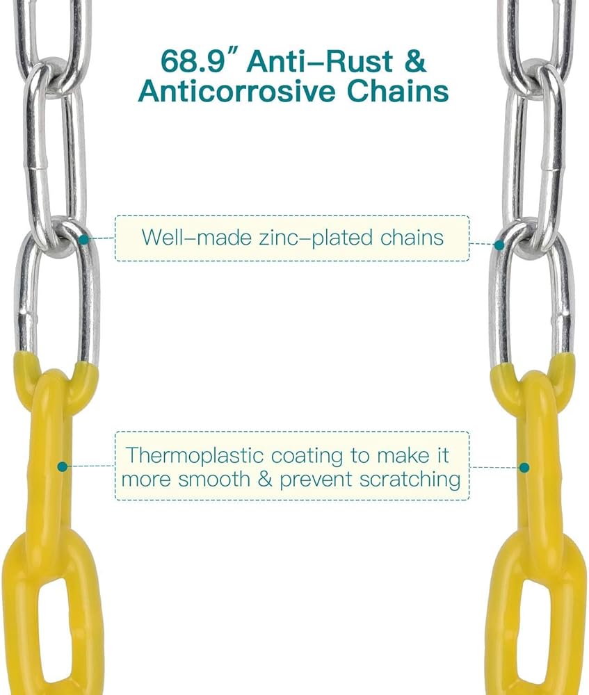 【Comfortable Anti-rust Chains】Two zinc-plated chains of swings for outside (68.9" long each) are covered with thermoplastic to prevent corrosion and rusting. The plastic coated chains perfectly avoid the harm they might cause and the environmental protection material is comfortable to touch. Besides, the swing seat and chain has passed the pull test and ASTM standard, both of which are strong enough and safety guaranteed.