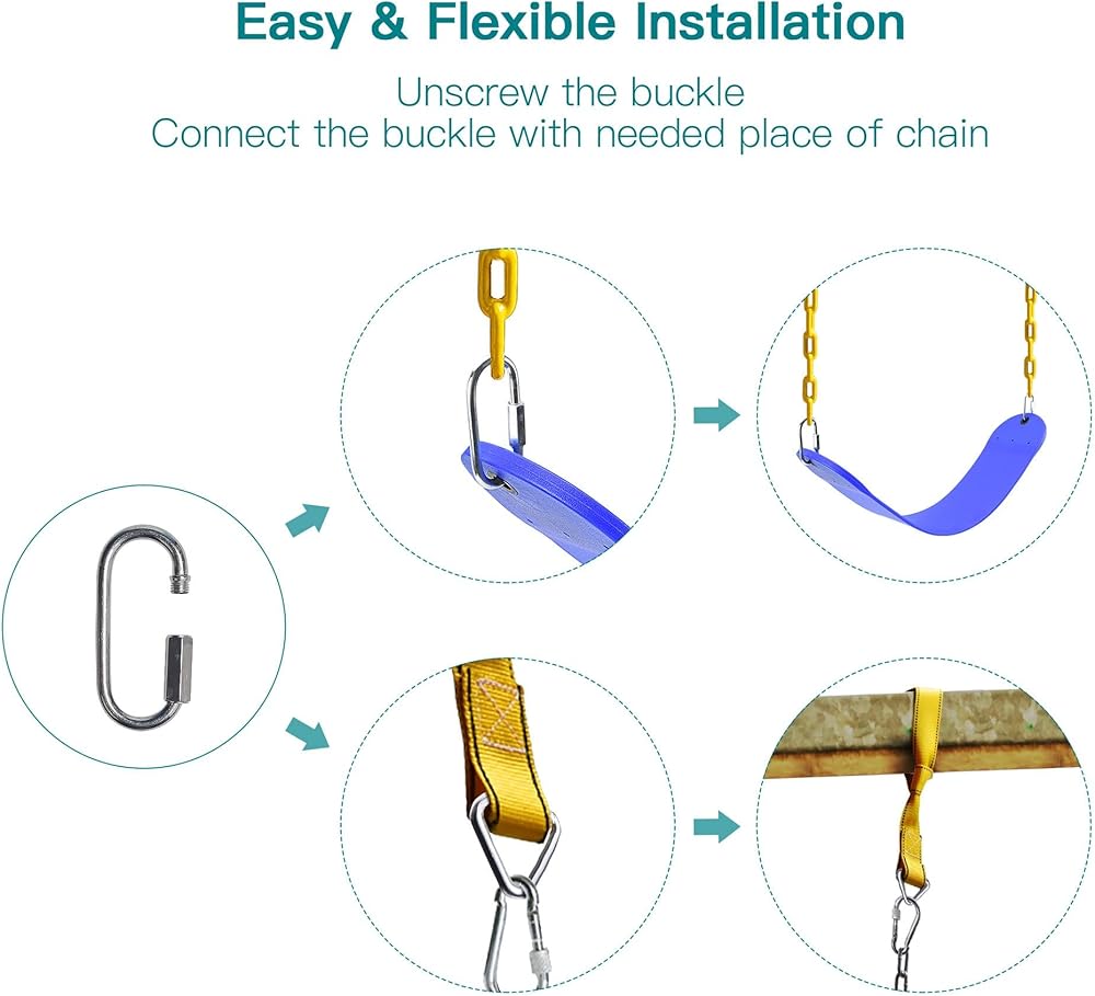 【Easy Installation & More Flexible Design】Our swing seats with chains provide extra locking buckles that are made of premium steel, which are steady and durable. The material solves the problem of rust on product surface. You can connect the buckle with the chain in the needed link, which makes the hanging installation more flexible. Unlike other kids swings' plastic plate connection buckle, our child swing seat connects with locking buckle that can easily take down for convenience.