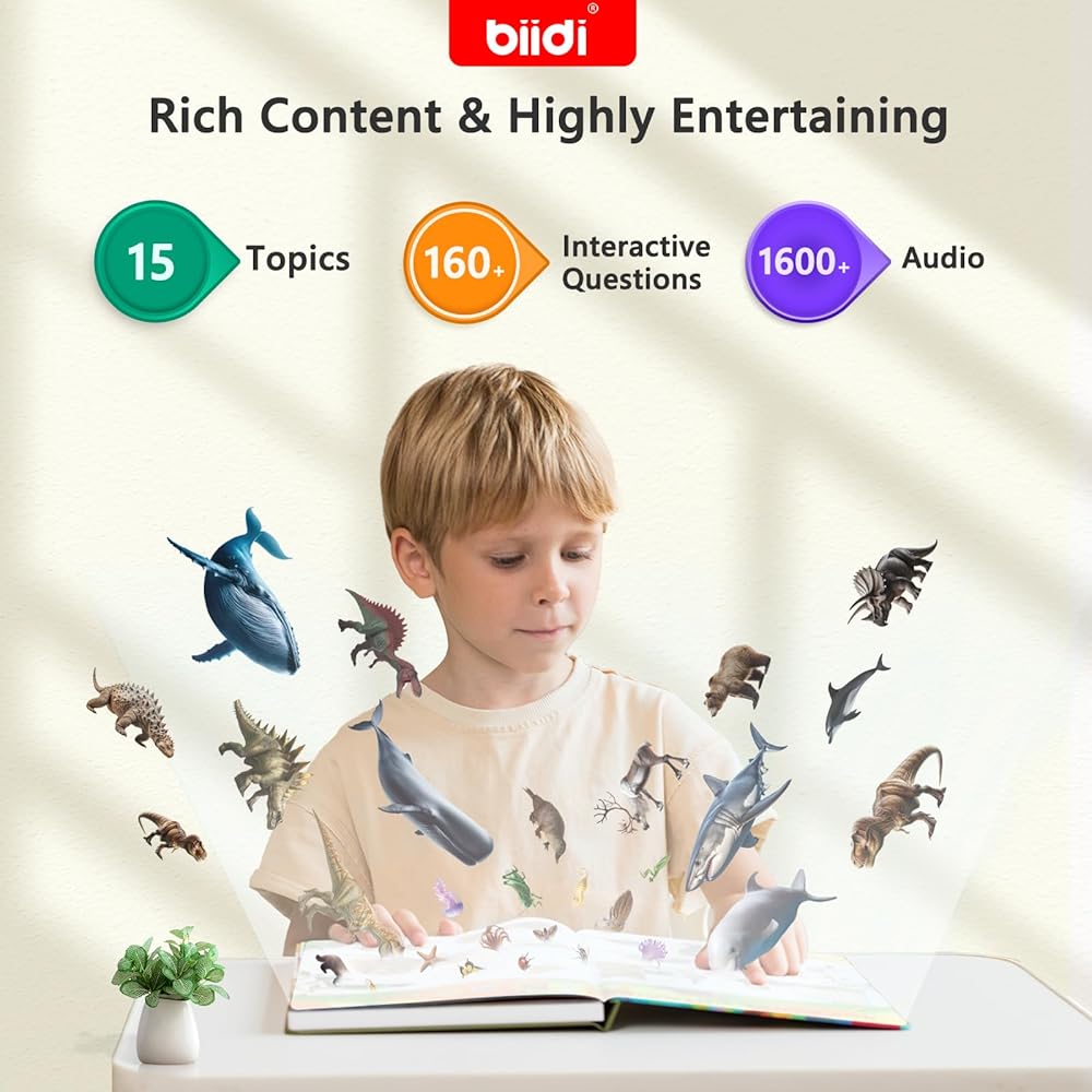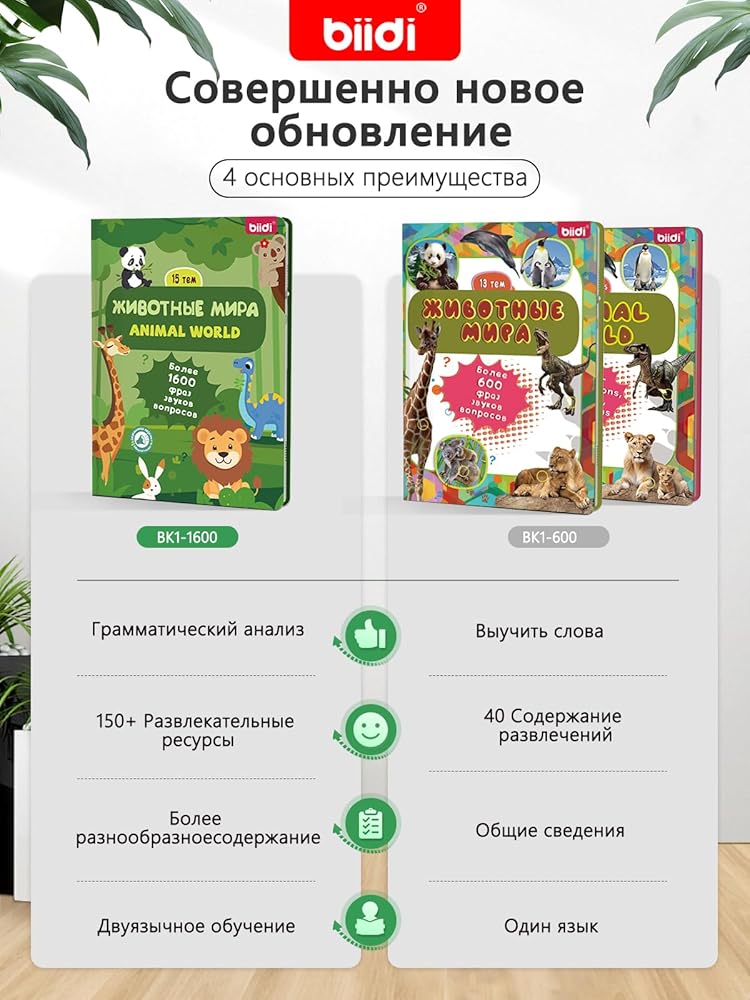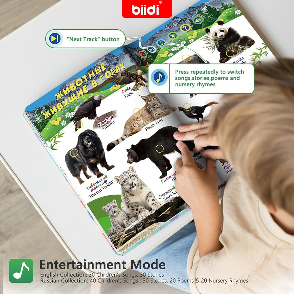 This talking children's book, designed for children aged 2 and up, is bilingual in English and Russian and contains over 1600 sounds. The sounds include: realistic sound effects, English words, Russian words, phrases, songs, fairy tales and fun challenge sounds, providing a fun way for children to learn. The World Around You book introduces children to a wide range of things they will encounter in life, including food and drink, kitchen utensils, everyday objects, occupations, musical instruments, toys, the universe, horoscopes, world monuments and countries around the world. ..... 15 themes and over 440 words. The musical toy book has 5 modes, supports individual sound switching, has bright and intuitive icons, and all pages are interactive. Press the start button and then the yellow circle on the page to hear the corresponding sound effect and the correct pronunciation of the word. All letters in the word are highlighted in different colors. It gives children more knowledge and develops their love of life. The musical book stimulates a child's genuine interest in reading and instills a desire to learn through bright pictures, lively sounds and rich content! The 30-page book is made of heavyweight paper suitable for regular use, so children can play by themselves or with friends, with full pages and pictures that won't fade. The simple and convenient TYPE-C charging connector is more reliable than USB and provides up to 6 hours of continuous use at medium volume! a musical book will be a great gift that will immerse children and their guests in fun and games for a long time.