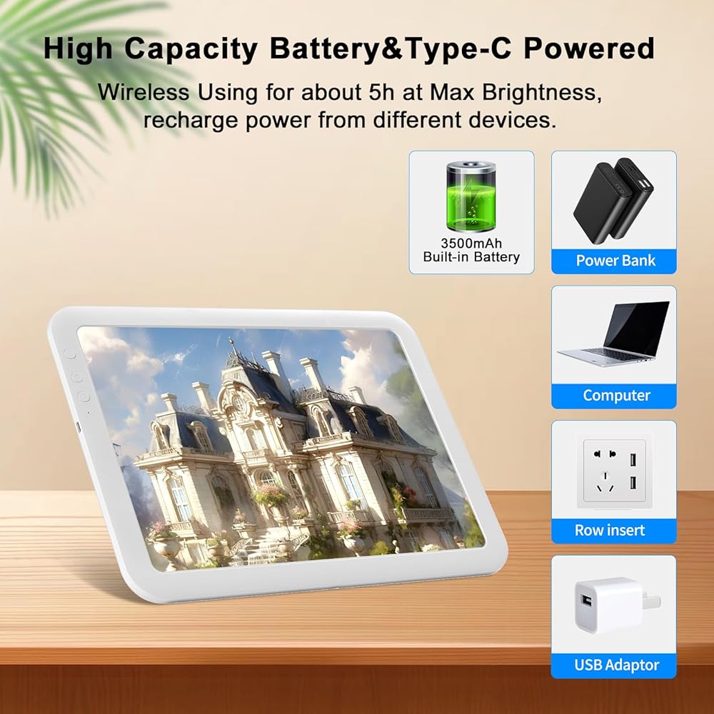 【Supports 3 Color Light Transformations】This WIRELESS lightpad A4 supports three colors of white light, natural light and warm light. It allows you to choose the most suitable color according to different content, making your art work more professional and handy. With an intelligent brightness memory function, this drawing light box will always remember your last choice, no need to readjust!