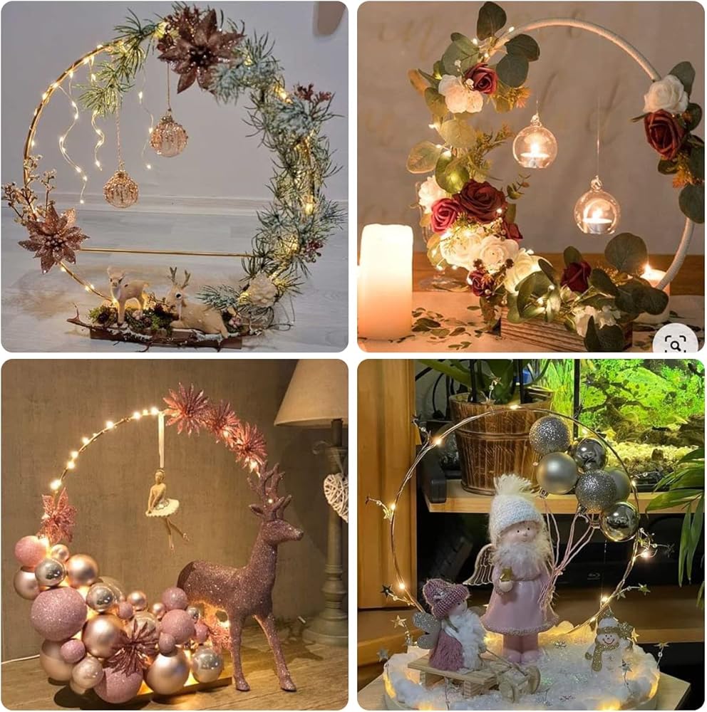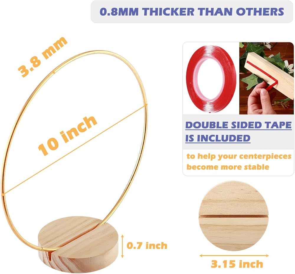 14 PCS Set: The package comes with 14-pack metal hoops for crafts, 14 pcs of round wooden stand, 14 pcs LED fairy lights 1 pack of double side tape, and 12 pcs gold butterfly decorations. Great combo for making any amazing metal floral hoop centerpiece.