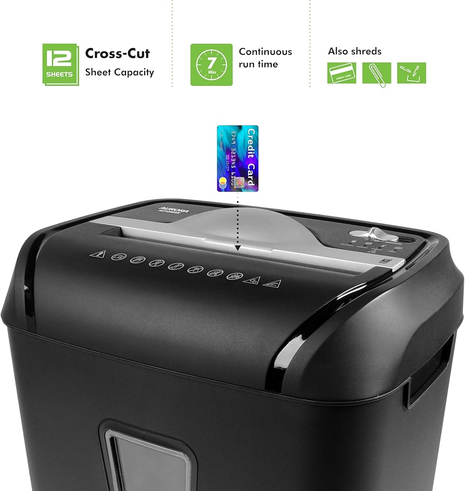 Crosscut with 12 sheet capacities; shreds credit cards and small paper clips.