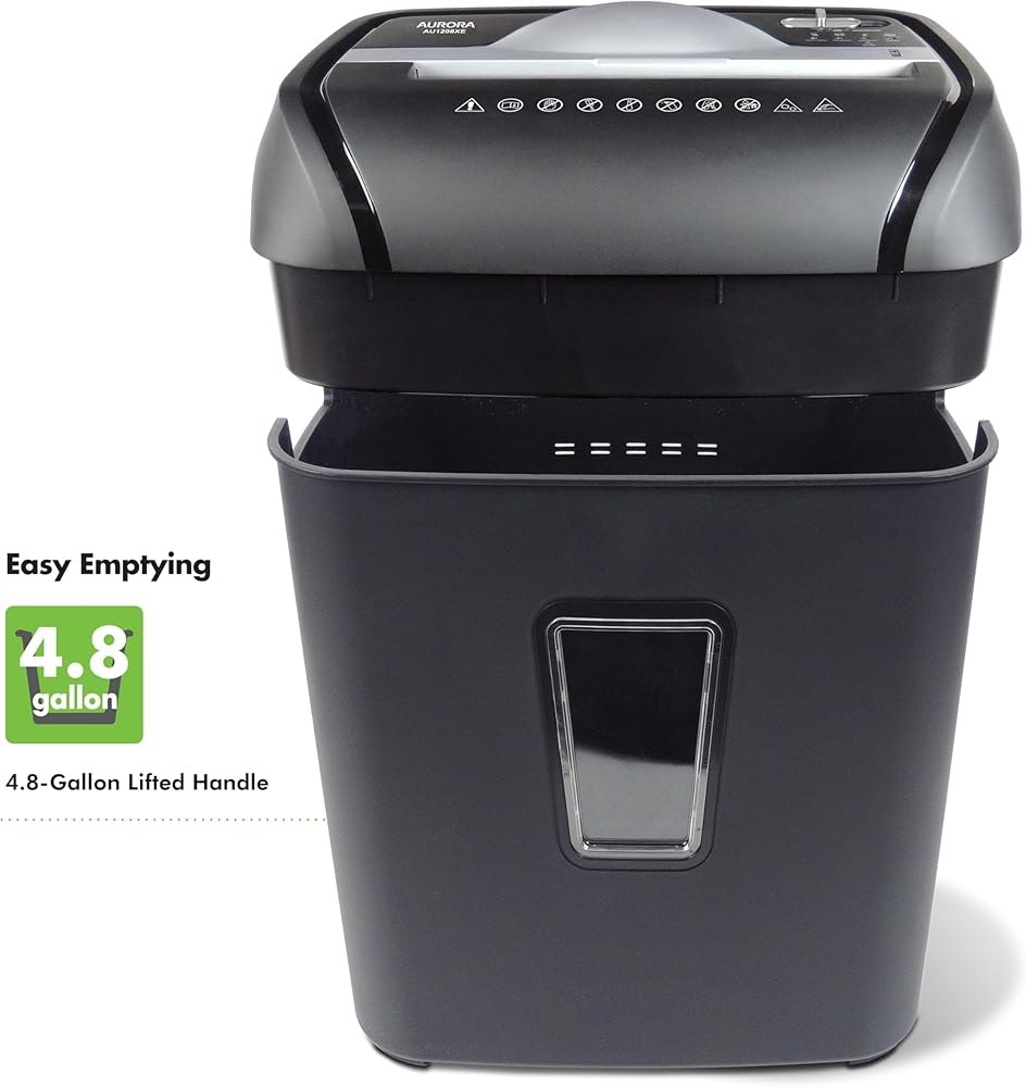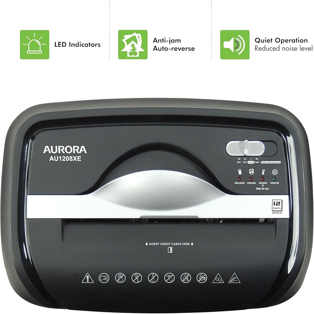 The Aurora AU1208XE 12-sheet crosscut paper/ credit card shredder with a 4.8 gallon wastebasket is the perfect business and home office device to keep you safe from identity theft. The AU1208XE accepts up to 12 sheets of paper at a time and shreds them into small pieces (3/16 by 1-9/16 inches), security level P-3.