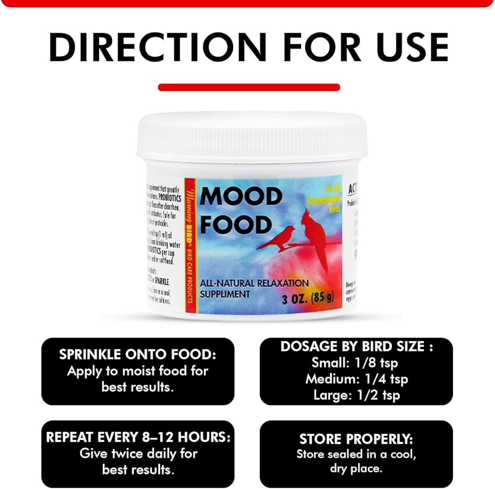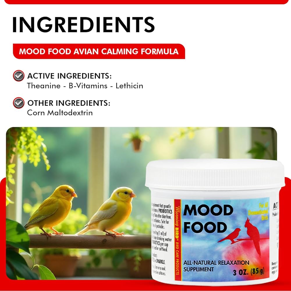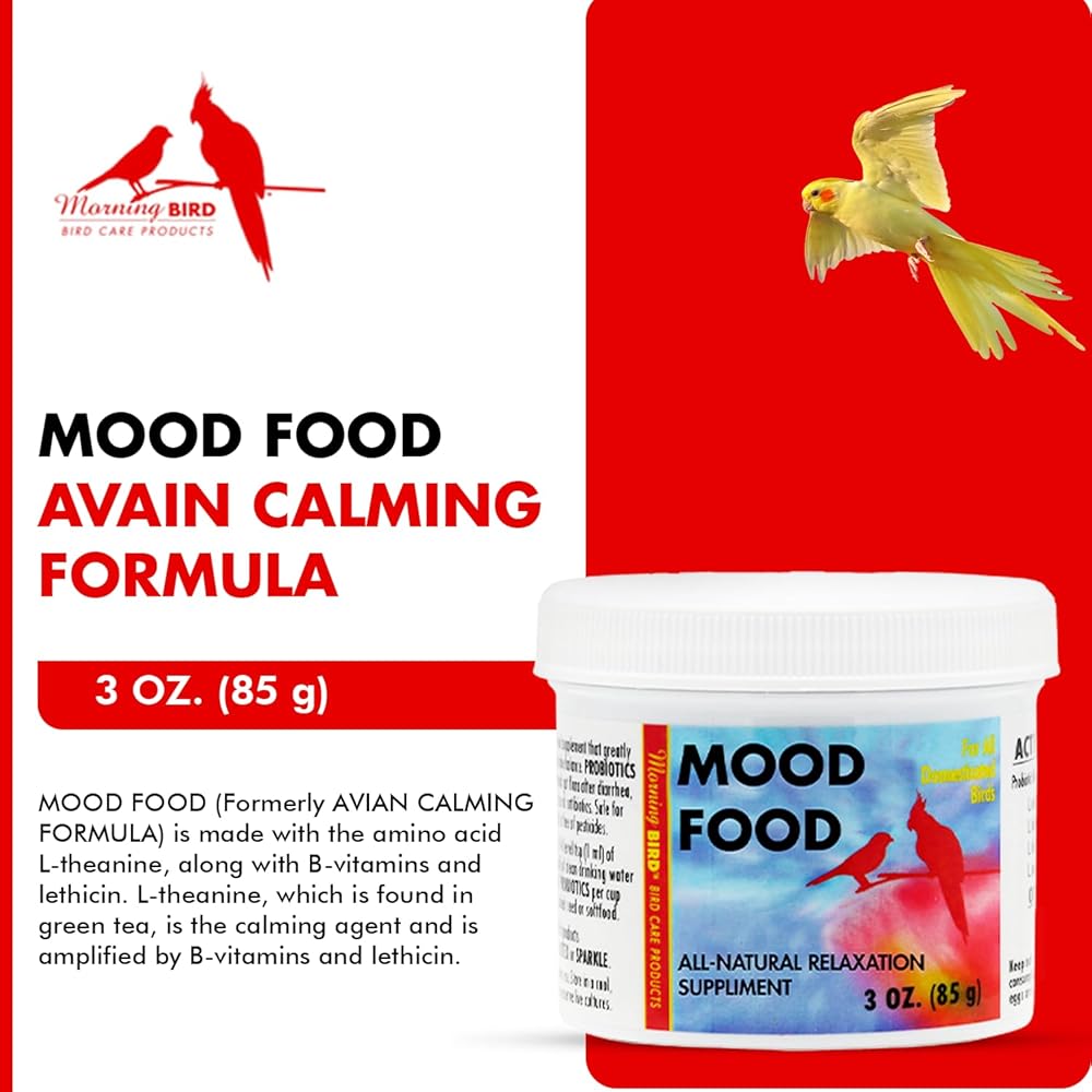 Morning Bird's Mood Food (Avian Calming Formula) is a non-sedating anxiety and stress relief powder for nervous birds or unwanted behaviors such as chewing, screaming, aggression, and feather picking. Avian Calming Formula can also be used for stressed birds in new environments or while traveling. The formula is made from human-grade ingredients, including the amino acid L-theanine, along with B-vitamins and lethicin. L-theanine, which is found in green tea, is the calming agent. The powder has a sweet taste that all birds love and is non-toxic and non-sedating. Sprinkle the appropriate amount on your bird's food (vegetables or moist seed) every 8 to 12 hours. Measurements vary depending on the bird's size. Use 1/8 teaspoon (0.5 g) for small birds (Finch, Budgie), 1/4 teaspoon (1 g) for medium birds (Grey, Amazon), and 1/2 teaspoon (2 g) for large birds (Macaw, Cockatoo). IMPORTANT: Keep the container closed before and after use. Store in a cool, dry place. Not for human consumption. Keep out of the reach of children.