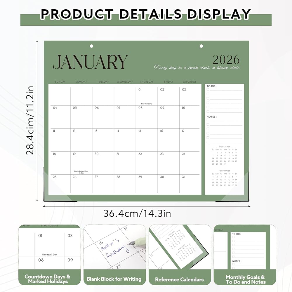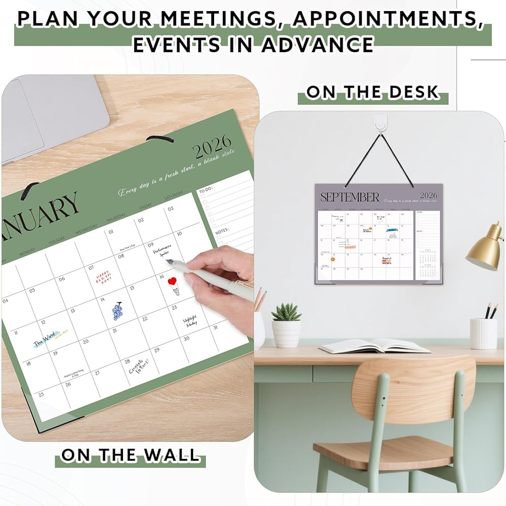 【Desk Use & Wall Hanging & Protective Design】Our 2025 - 2026 desk calendar is built for long-term use, with a waterproof transparent cover and protective corners to protect the pages from dirt and wear, ensuring your calendar stays in great condition even with frequent use. It also includes two hanging holes and a sturdy rope, allowing you to hang it on the wall or use it on a desk.