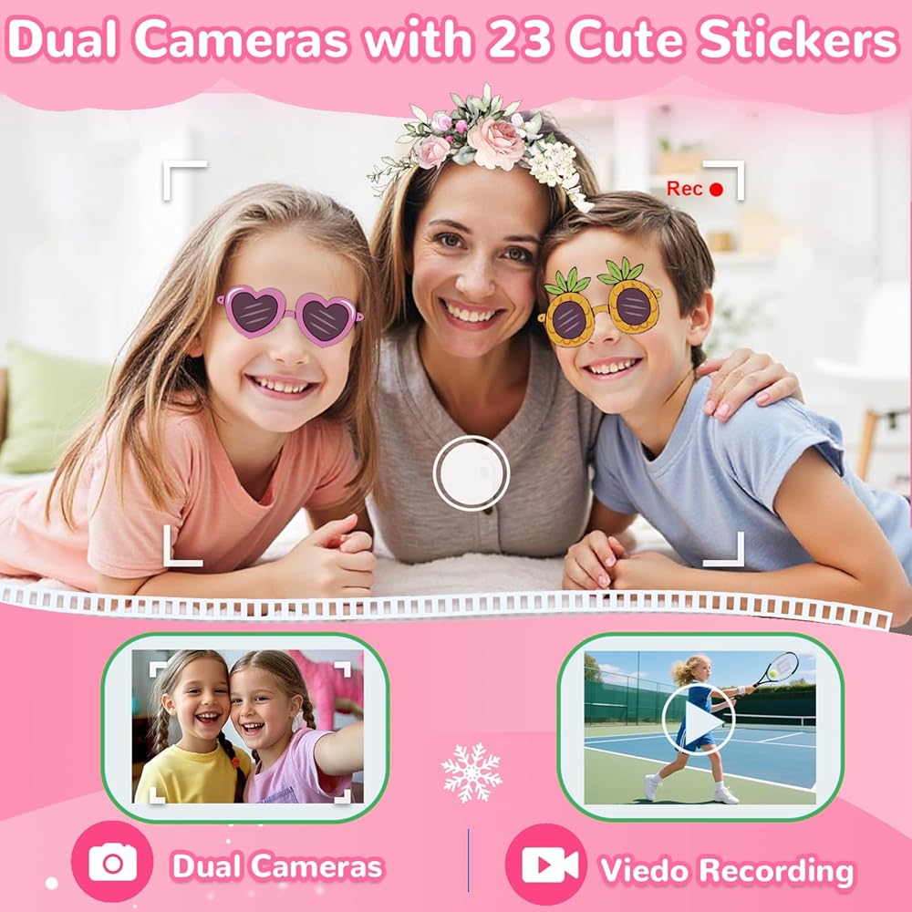 Dual Camera with Adorable Stickers: Kids cell phones support dual cameras to take pictures and video recording, just like a real smartphone. With 19 cute stickers, kids can pick their favorites to snap pictures and record videos, capturing precious moments and fun experiences with family and friends. It's a great way to let their creativity shine!