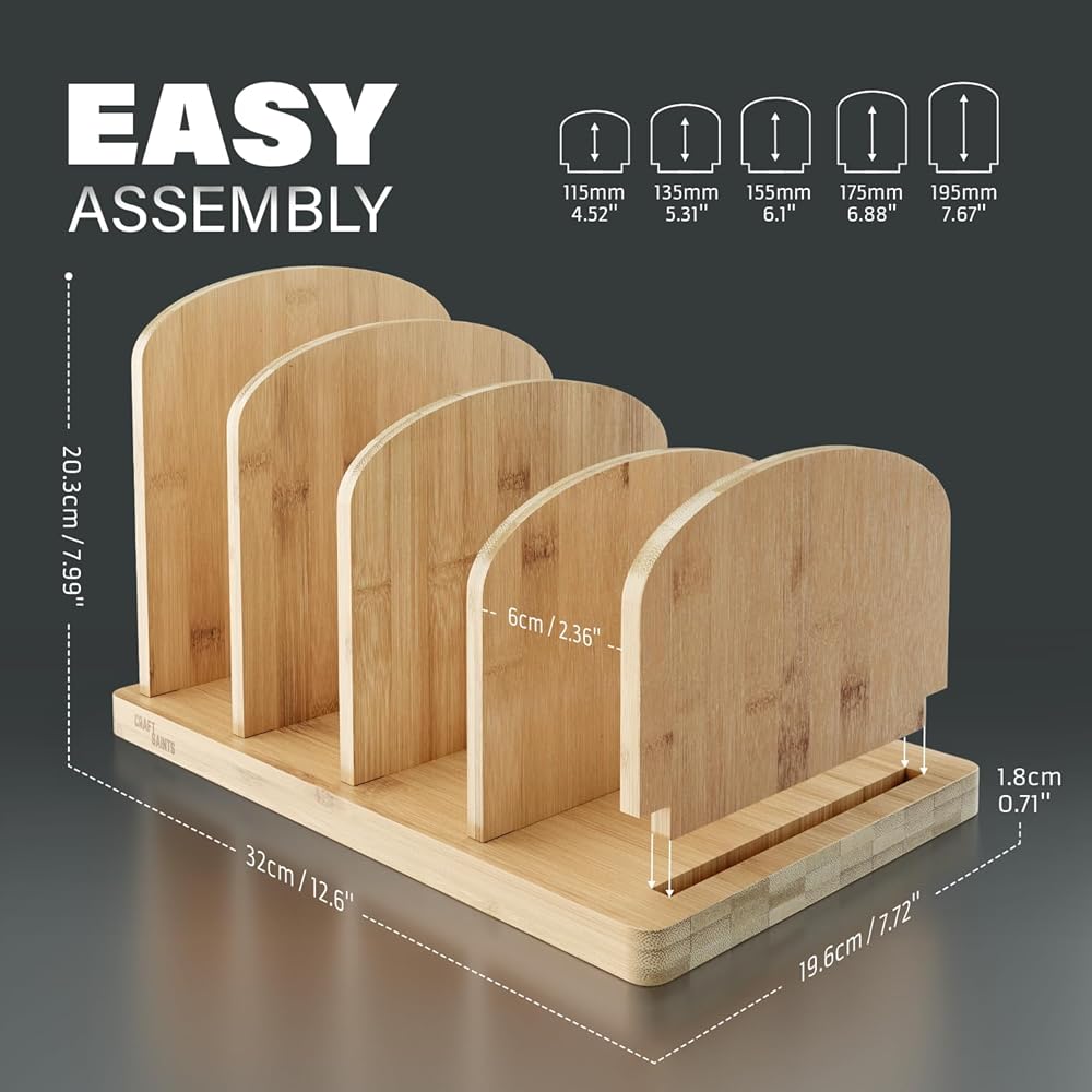 EASY ASSEMBLY & SPACIOUS - Our table top bookshelf comes in 6 separate pieces, 1 base and 5 divider sheets, all you need to do is insert the divider sheets into the base layer and you are done! You can assemble the desktop bookcase in under a minute, which makes it a hassle-free experience. Each slot of the recipe holder provides ample space to store several standard sized books, the dividers of the cookbook bookcase enable you to organize your books into several sections for easy access.