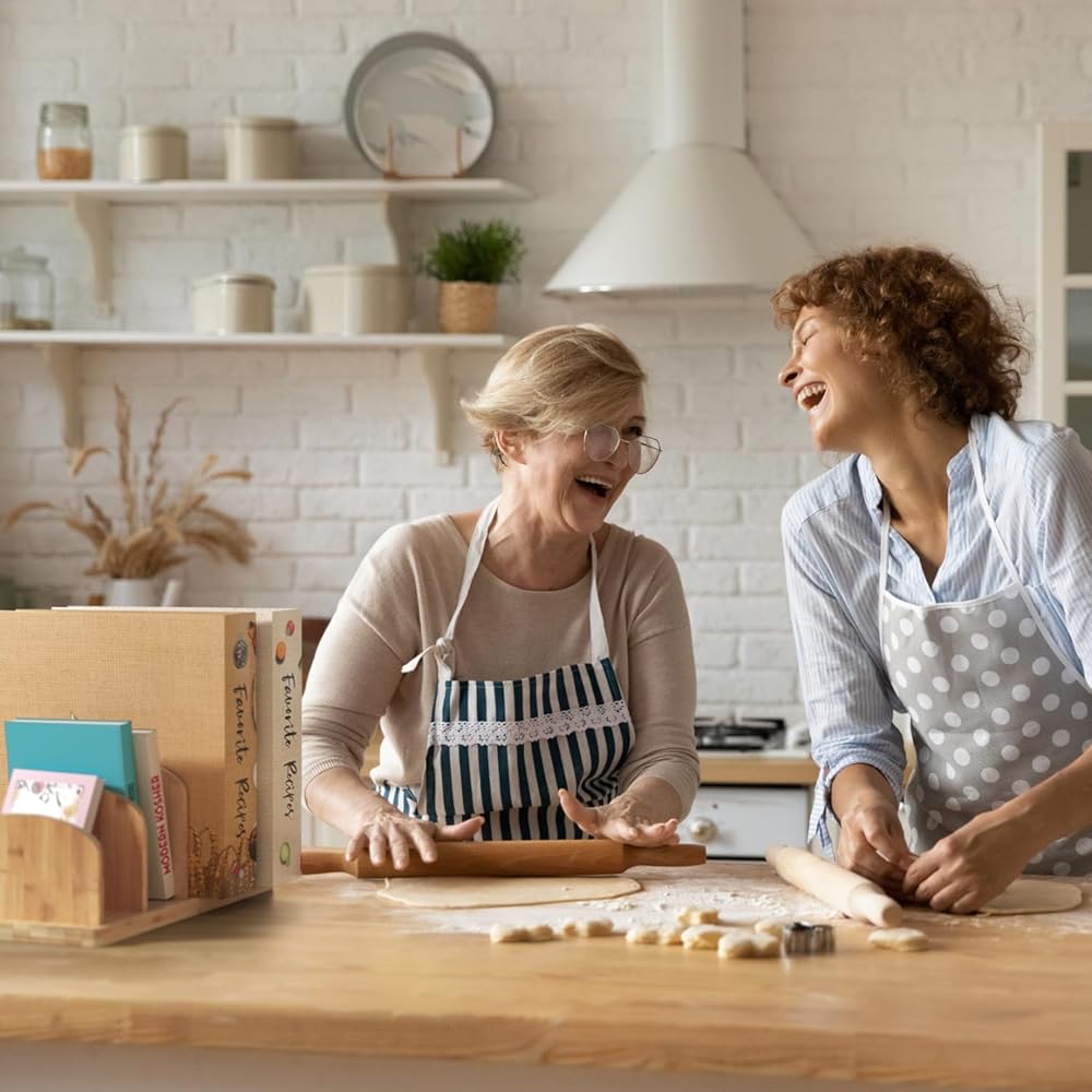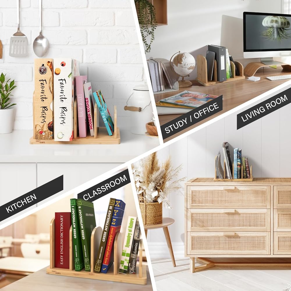 CONVENIENT KITCHEN COMPANION - The bamboo kitchen countertop cook book organizer features four 2.36'' slots, providing ample space to store your cookbooks, recipe cards, recipe binders & other essentials. With this desktop bookshelf, you can keep everything within reach, saving valuable countertop space and making cooking more efficient. Beautiful bamboo aesthetic combined with a practical overall design makes our mini bookshelf the perfect kitchen companion.