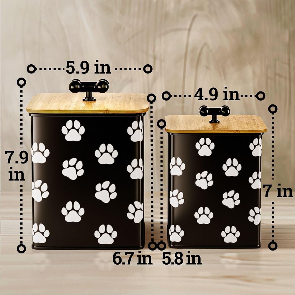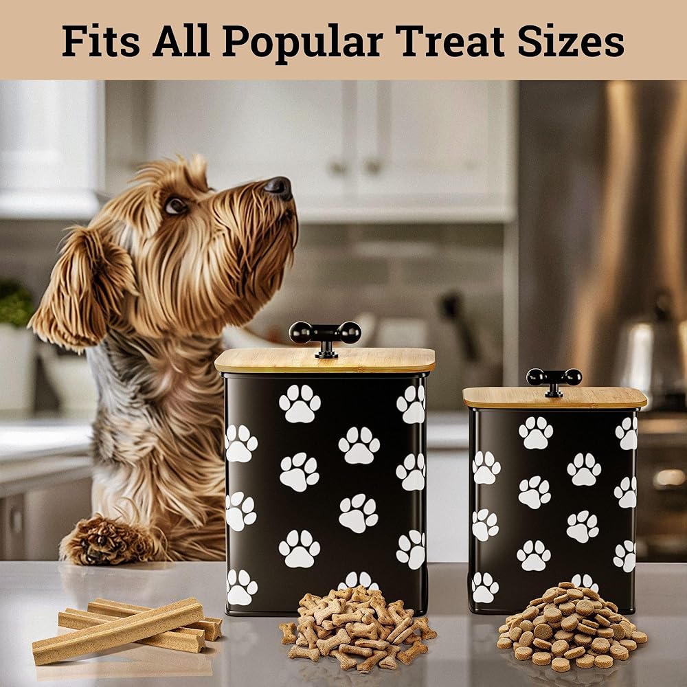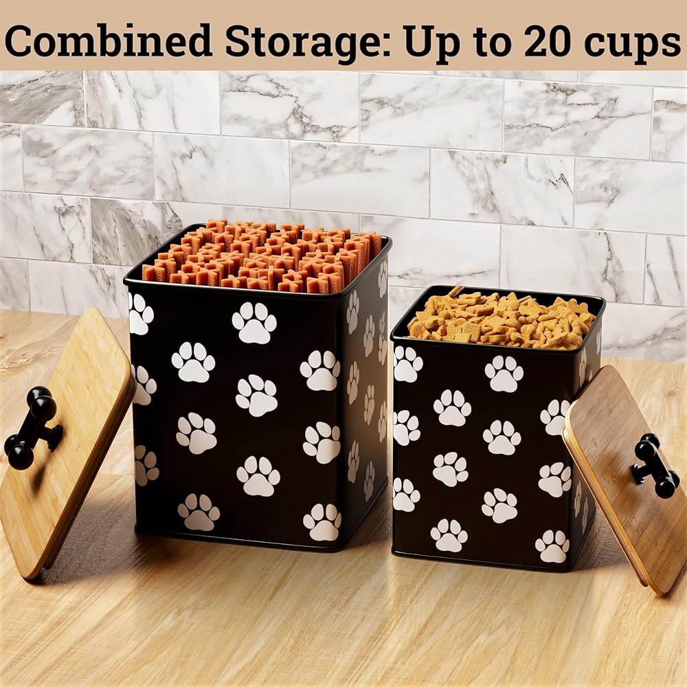 Dog Treat Container Airtight Set of 2 - 8x6 & 7x5 inch Iron Dog Treat Jars for Kitchen Counter with Airtight Bamboo Lids - 20 Cup Capacity Pet Treat Container Set - Doggie Cookie Jar - Treats Canister