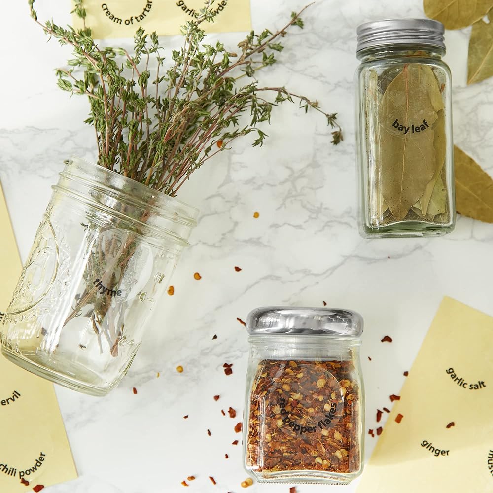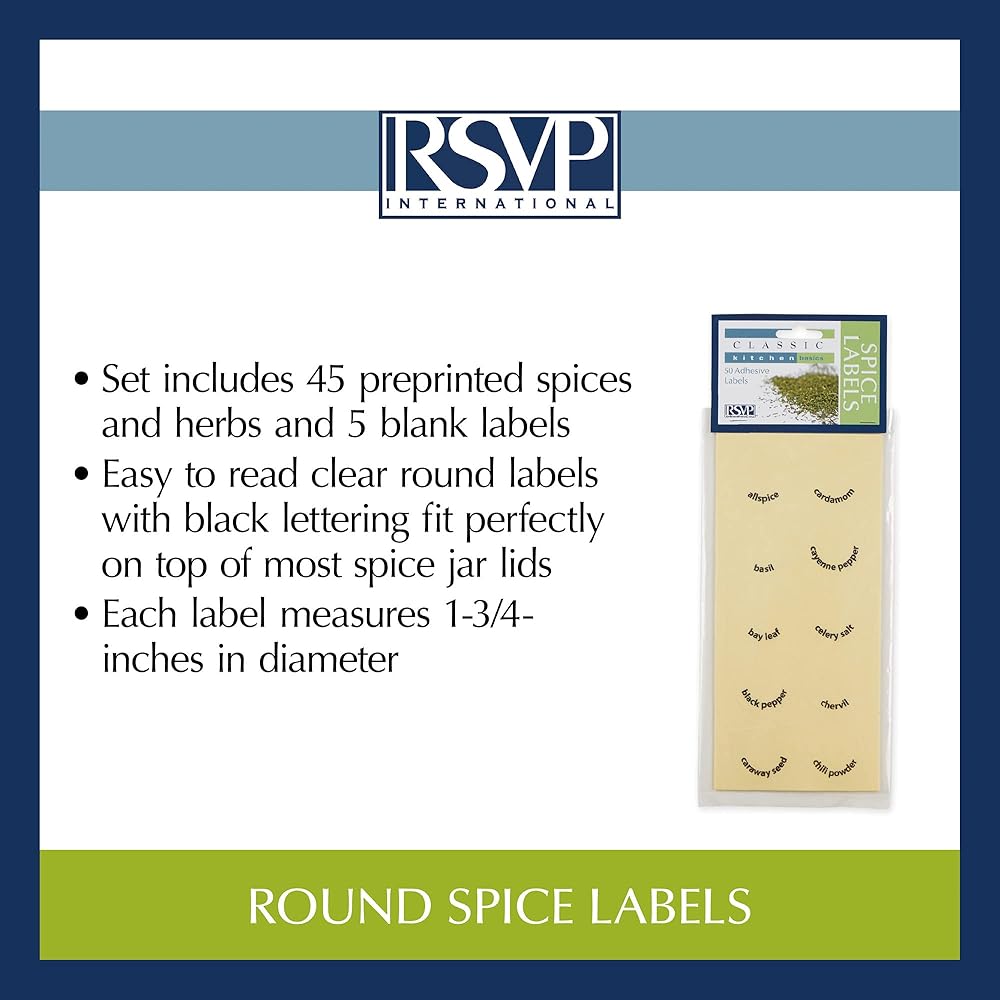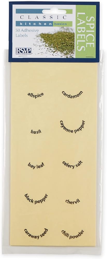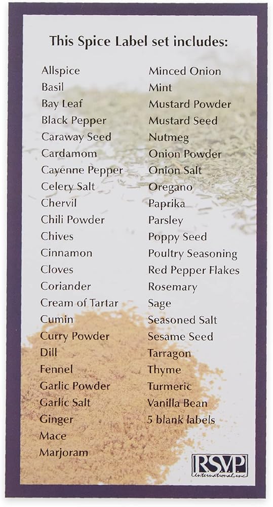INCLUDES: Set of 50 with 45 preprinted spices and herbs and 5 blank labels