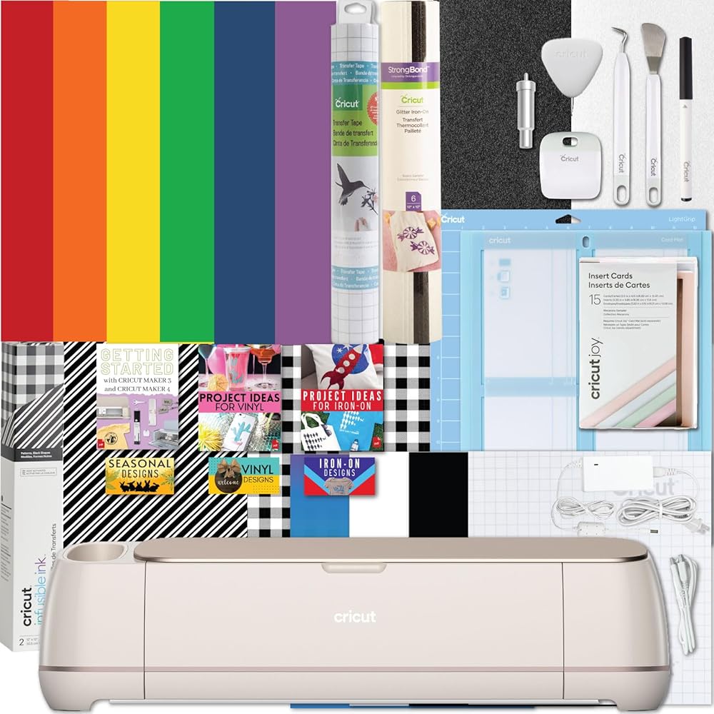 INCLUDES: 1- Cricut Maker 4, 1- Cricut Rainbow Vinyl Sheets, 1- Cricut Joy Iron-on Sampler (should be used with cutting mat), 1- Cricut Infusible Ink Sheets Pack, 1- Cricut Card Set, 1- Cricut 2x2 Card Cutting Mat, 1- Maker 4 Digital Guide with instructional manual, project tutorials and inspiration, SVG Digital Designs and more (print copy unavailable), In the Maker 4 Box: Cricut Cutting Mat, Pen, Sample Materials, Fine Point Blade, Mini Weeding Tool