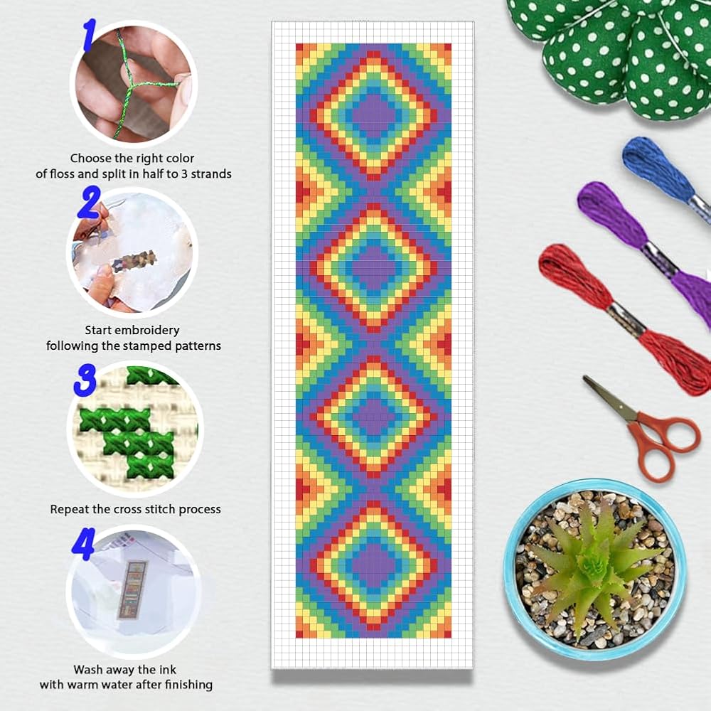 Pre-printed Geometric Patterns: The cross stitch cloth is pre-printed with geometric patterns and numbers, which is convenient for accurately finding the corresponding embroidery thread. Just follow the instructions and use the needles in the set to complete the cross stitch bookmark.