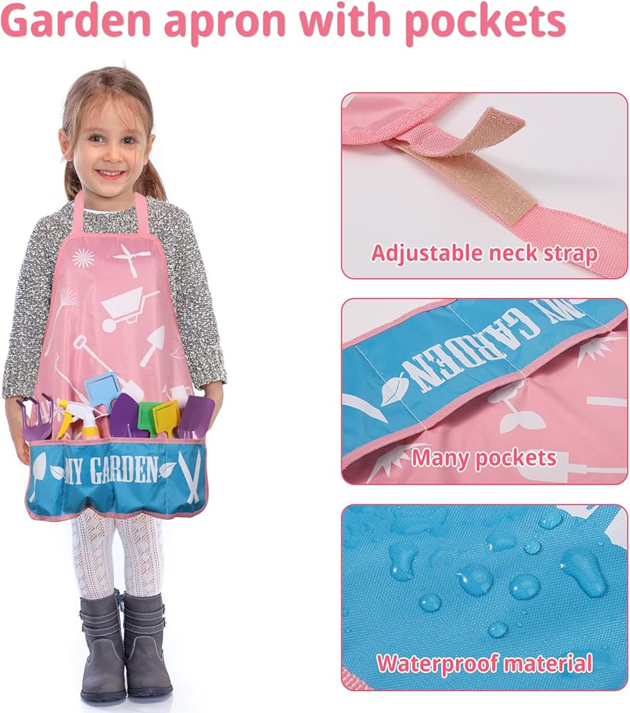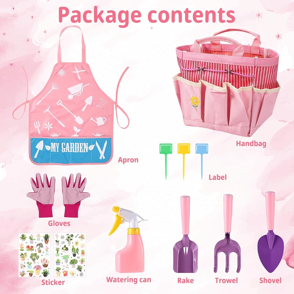 Package Includes: You will receive a gardening tools set, including fork, shovel, rake, bag, bottle, glove, apron, 3 tags, 2 stickers, this set can meet your children's play needs.