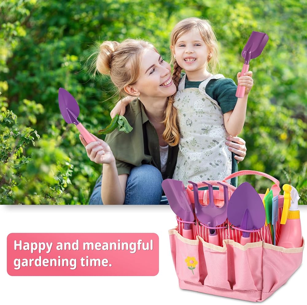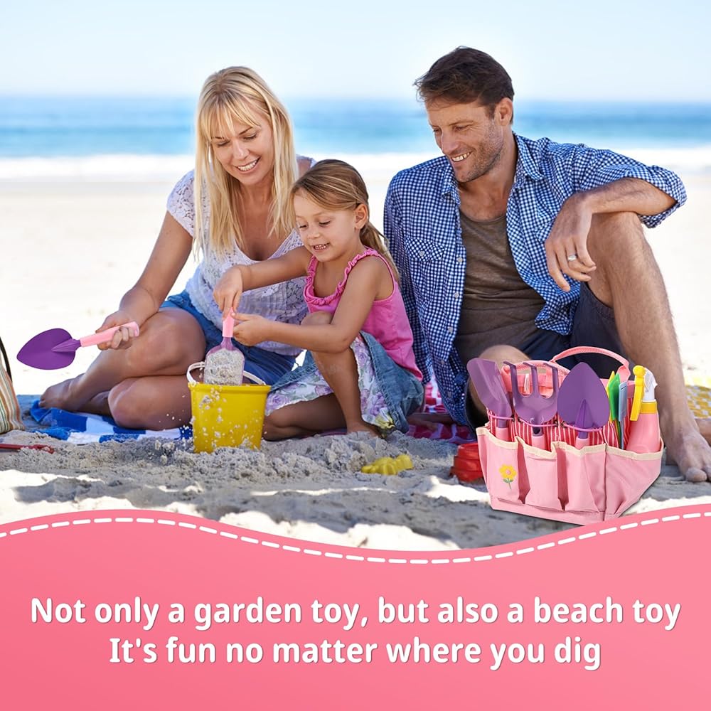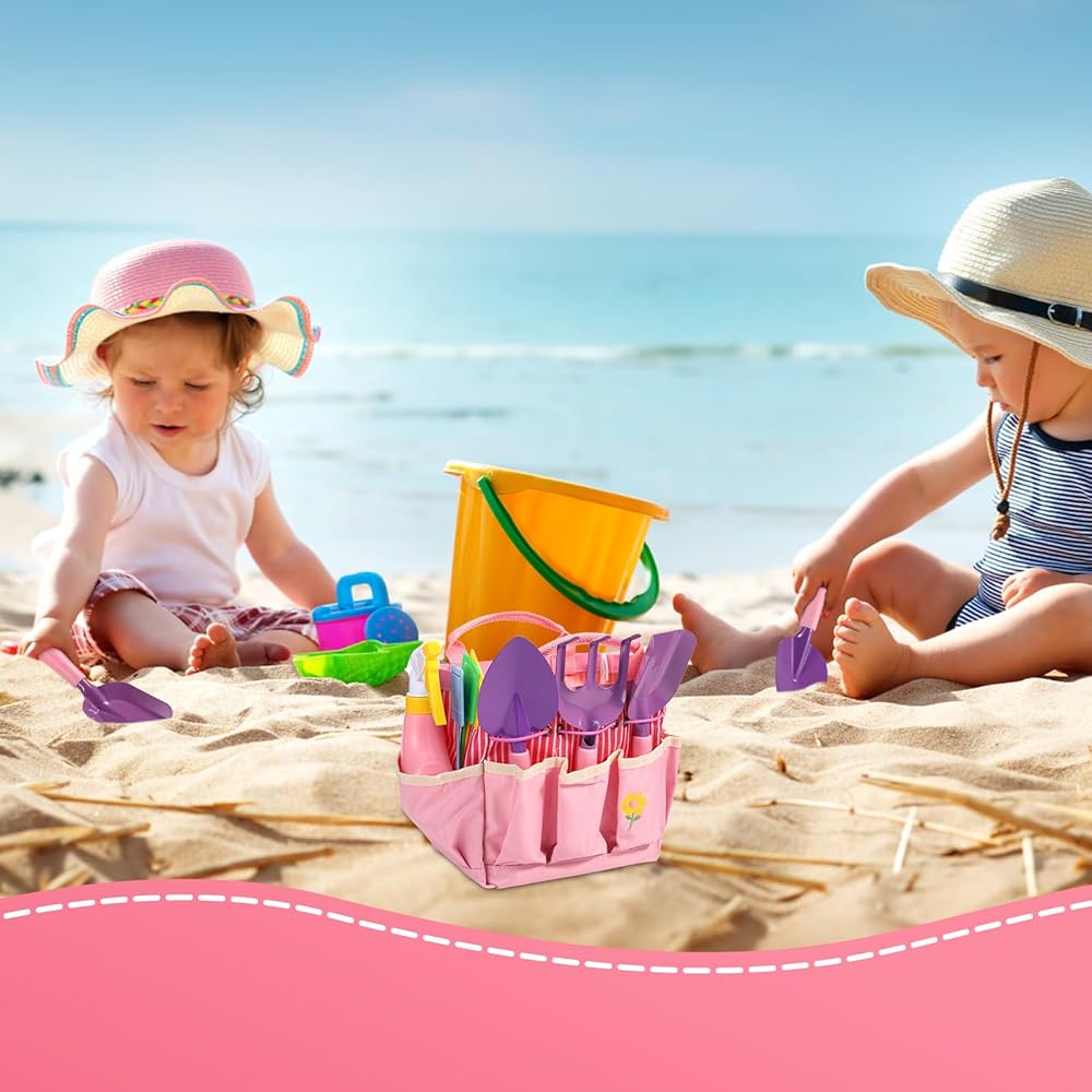 12pcs Gardening Tools Set, Kids Gardening Kit with Fork, Shovel, Rake, Bag, Bottle, Glove, Apron and Watering Can, Toddlers Garden Tools for Children Summer Beach Toys for Boys Girls (Pink)
