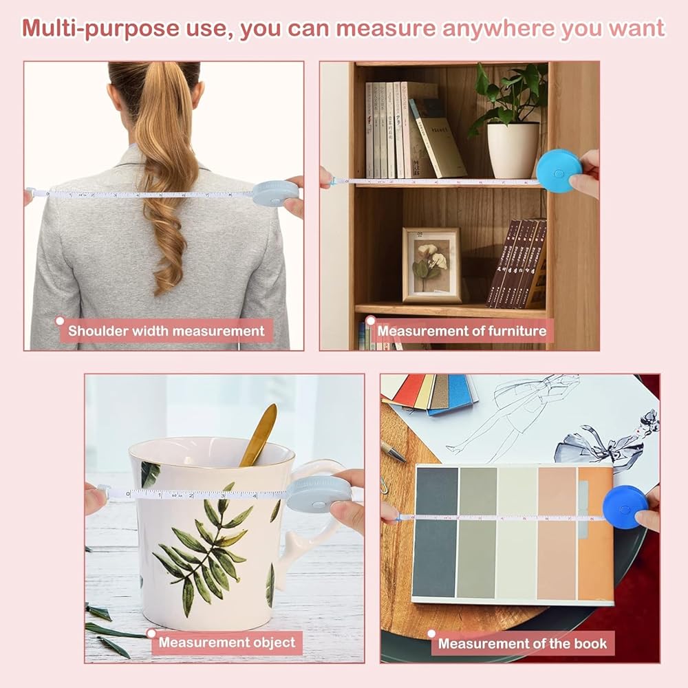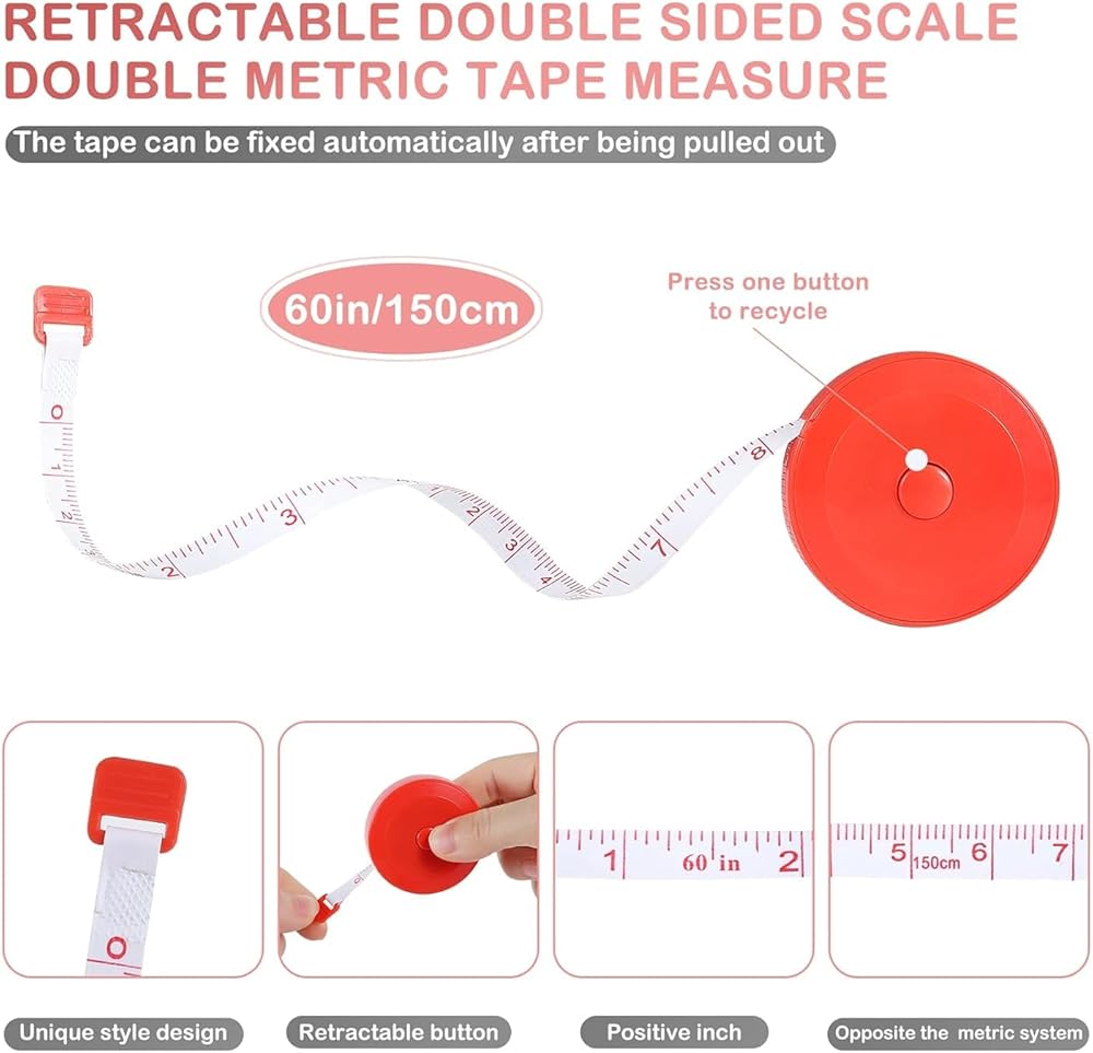 ⭐ HIGH QUALITY MATERIAL: Our retractable measuring tape is made of non-stretch PVC material, which is durable and long-lasting. There is a portable plastic case on the outside, and the flexible vinyl tape measure inside has a length of 1.5M/60INCH, which fully meets your requirements for measuring materials.