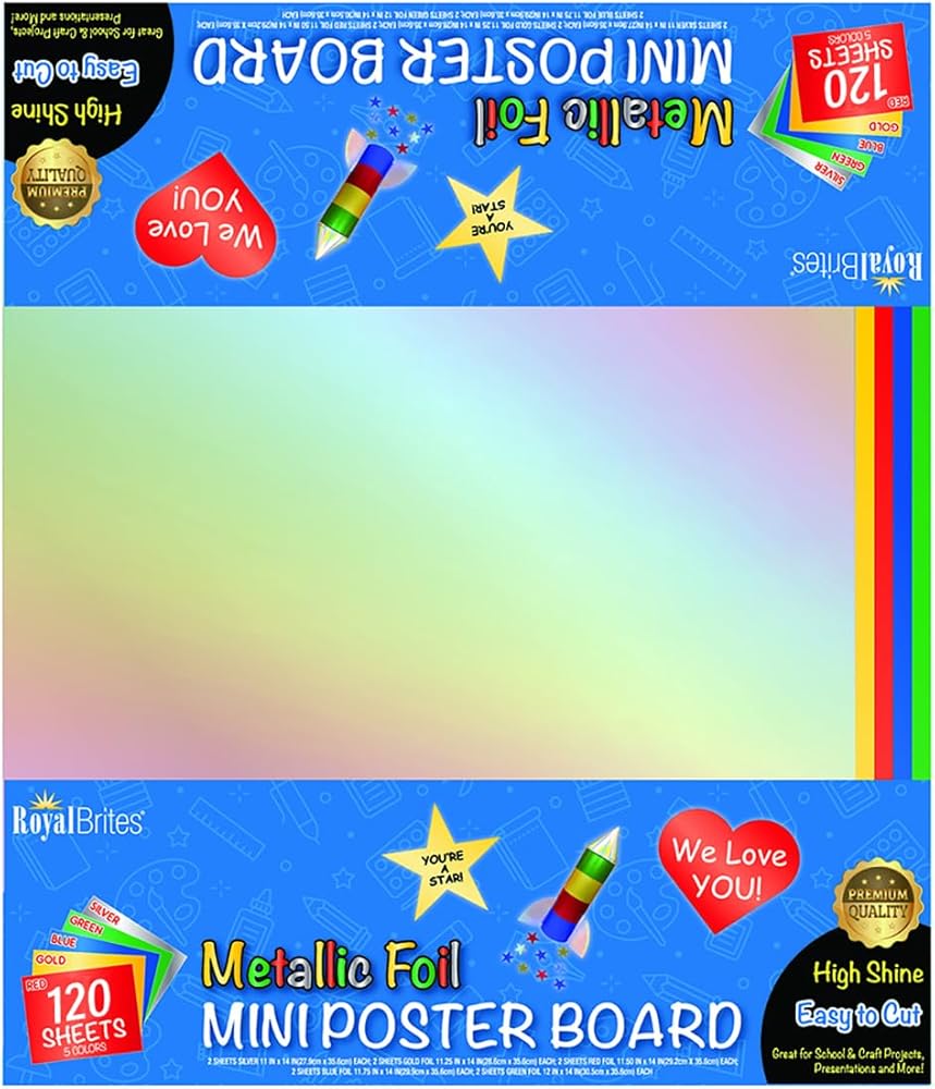 Elevate your creative projects with the Royal Brites Mini Metallic Poster Board Papers. Crafted for versatility, these metal-looking papers measure 12" x 14” making it flexible for a variety of uses. Whether you're working on school projects, holiday crafts, small signs, card making or even scrapbooking, the metal surface brings an element of elegance. With ten sheets in total, of five different colors – gold, silver, red, blue and green there is a nice variety in each package. The paper is durable, yet easy to cut making it ideal for any craft project, including those involving foil paper. The Metallic Mini Poster Board Paperss come in a package that can be used to store the product after use. Whether you're a student, artist, or crafter, Metallic cardstock Papers make all your projects a bit more special.