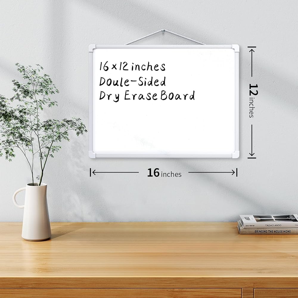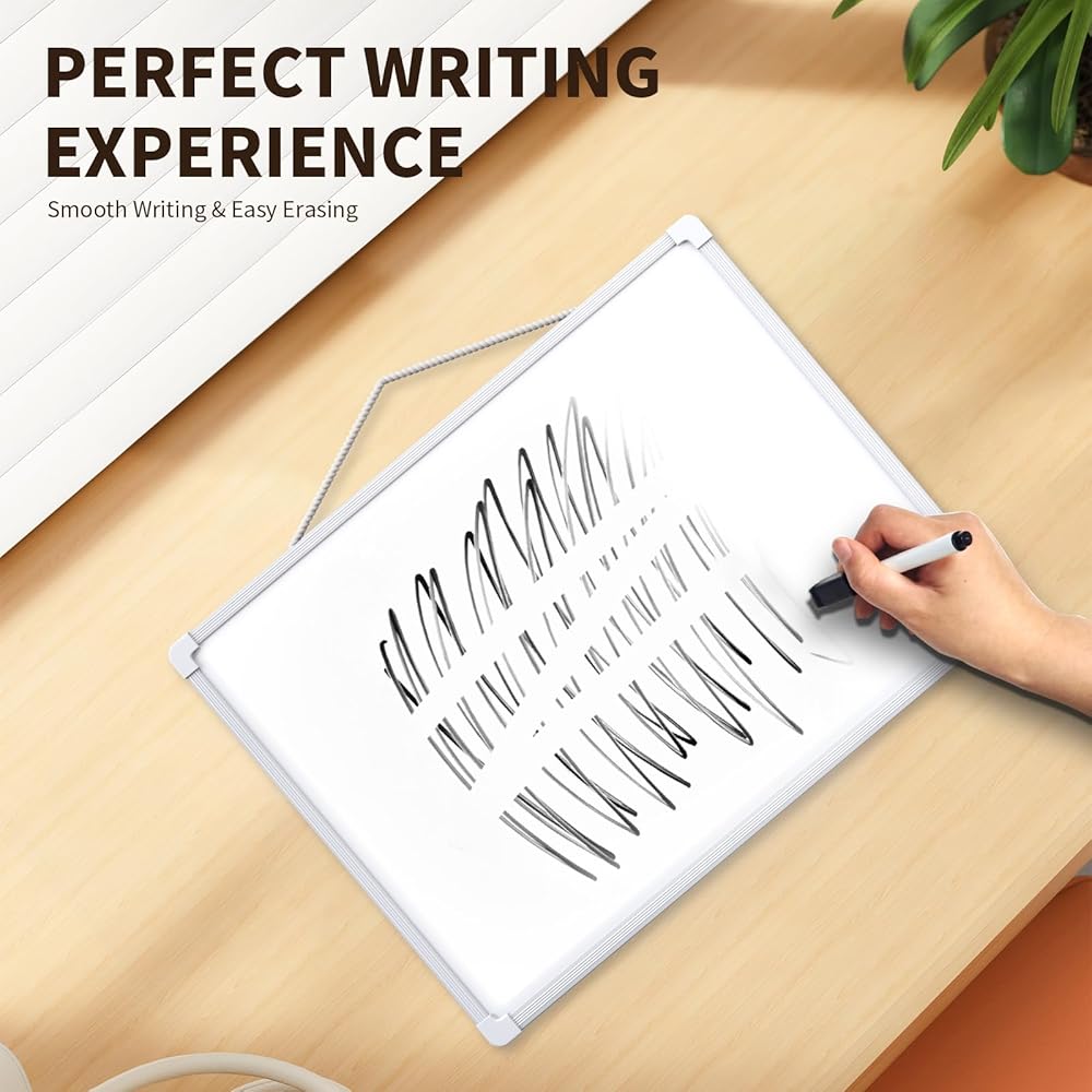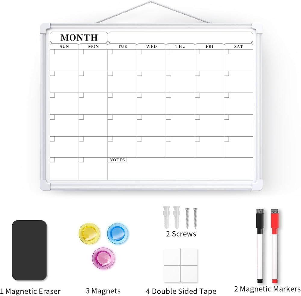 Duarble Material: Made from high-quality, long-lasting materials, the 16" x 12" double-sided dry erase board is built to withstand daily use. Includes a board with a side lanyard, 2 magnetic markers with built-in erasers, magnets, a magnetic dry eraser, and four double-sided adhesive tapes. Double-Sided Design: Features a blank whiteboard on one side and a monthly dry-erase calendar on the other. This dual design provides ample space for writing, planning, and organizing tasks, making it perfect for events, reminders, and to-do lists. Versatile Hanging Options: Equipped with a hanging lanyard for easy wall or shelf mounting. The included double-sided tapes allow for quick installation on clean surfaces without the need for drilling. Hang it horizontally or vertically to suit your needs. Smooth & Easy to Clean: The scratch-resistant surface ensures smooth writing and effortless cleaning without leaving stains. Conveniently store markers on the board using the magnetic strip on the pen caps. Portable & Multi-Purpose: Lightweight and portable, this 16" x 12" dry-erase board is ideal for home, office, school, or on-the-go use. Perfect for planning, drawing, memos, and more. A great gift choice for students, teachers, and professionals alike.