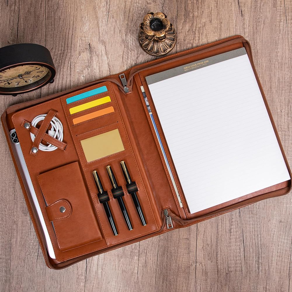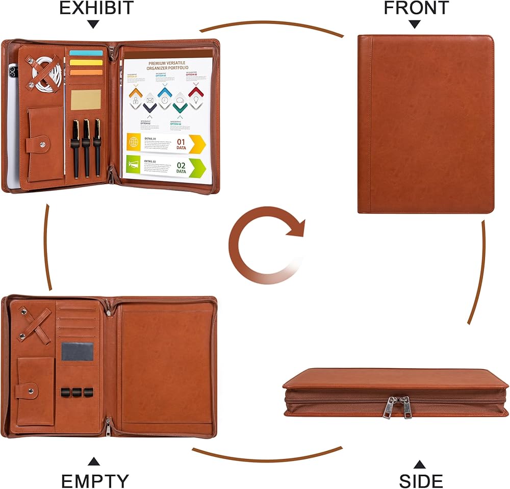 Portfolio Binder with Zipper, Vegan Pu Leather Padfolio for Men and Women, Business Document Organizer with A4 Letter Sized Writing Pad Holder, Laptop Pocket,and Business Card(Brown)