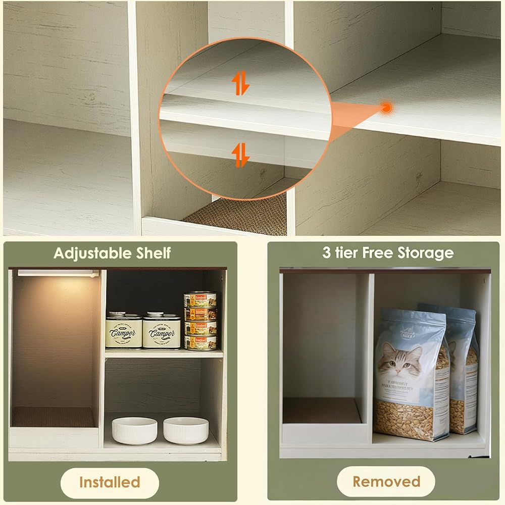 【Adjustable Open Shelf】The right side open shelf is an adjustable storage area where you can keep cat dry and wet food, water bowls, cat fountian, and feeders in the litter box cabinet. The shelf board is detachable and customizable to fit your needs