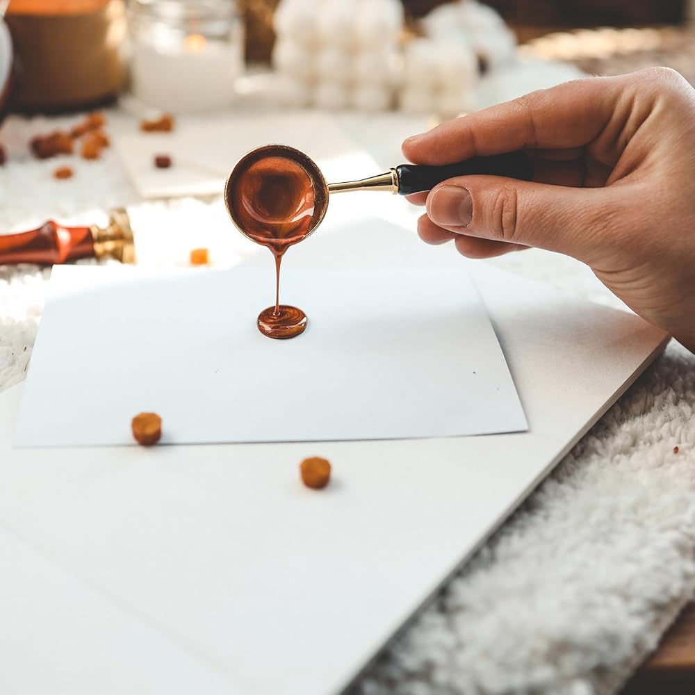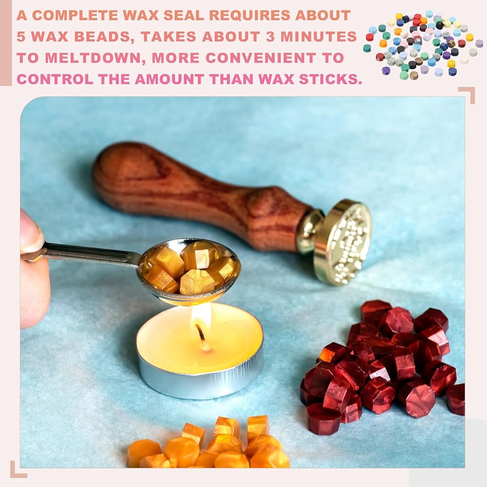 Instruction: Fully melt the wax beads, takes about 3 minutes, pour the melted wax on the seal position, press with a stamp, and complete the sealing after cooling.